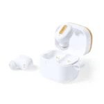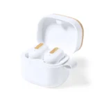 Auriculares inalámbricos fabricados en RABS, bambú y silicona. Cada auricular cuenta con un botón touch que permite contestar y finalizar llamadas, reproducir y pausar música, cambiar a la siguiente o anterior canción. Tienen tecnología Bluetooth 5.3, una duración de batería de aproximadamente 4 horas y un estuche de carga de 300 mAh, el cual se carga a través de un cable usb c. Los auriculares cuentan con almohadillas de diferentes tamaños.