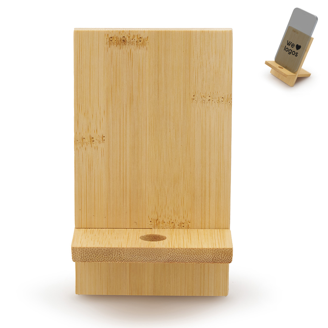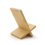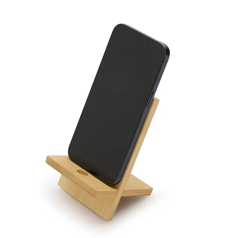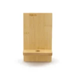 Soporte para teléfono fabricado en bambú. Incluye un orificio que permite el paso del cable facilitando la carga del dispositivo mientras está en uso.