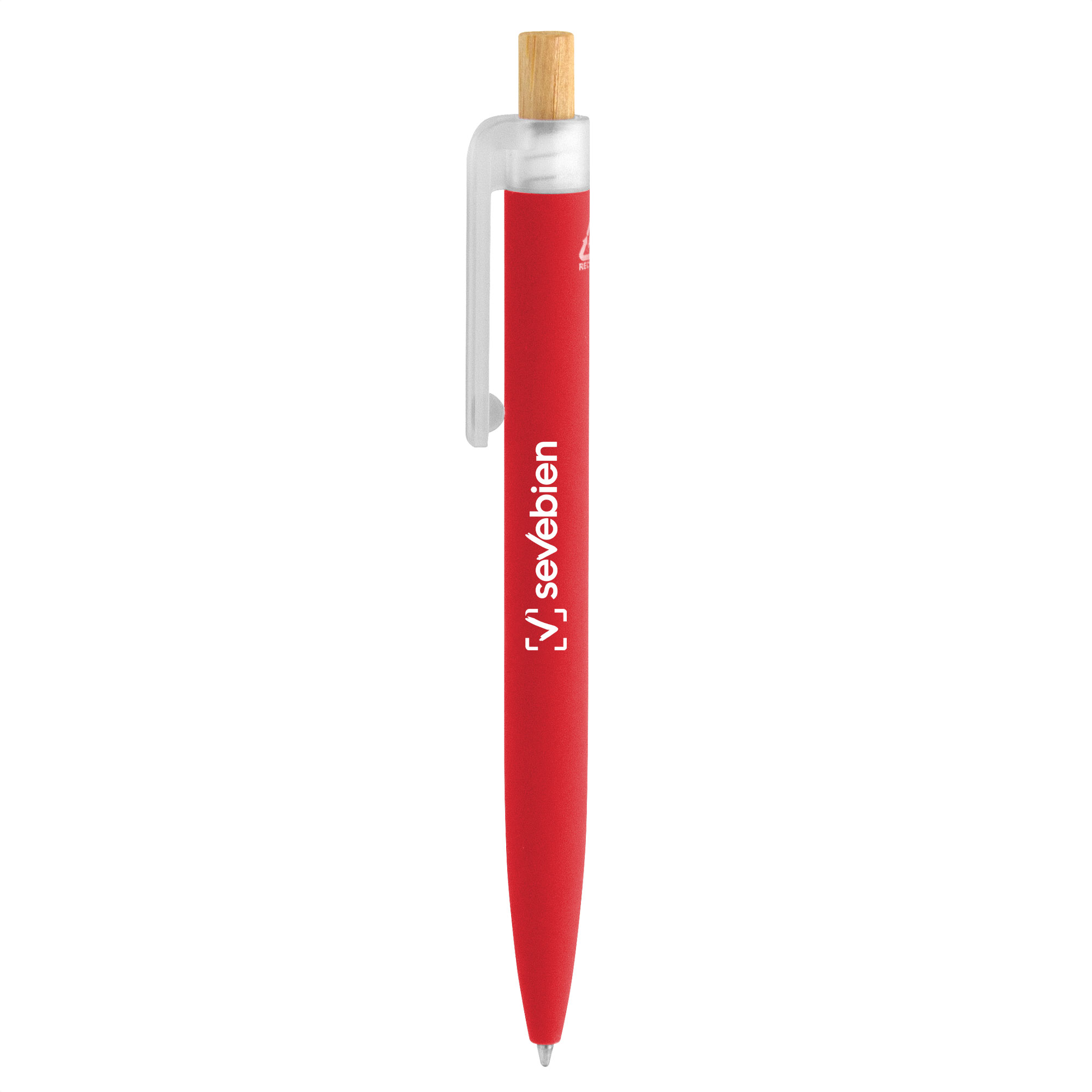 Fusiona lo moderno, elegante y ecológico.Bolígrafo retráctil. Cuerpo de aluminio en diferentes colores, acabado mate engomado, muy suave al tacto. Botón pulsador de bambú. Clip plástico transparente con terminación frosty. Medidas: 1,6 x 13,4 cm.