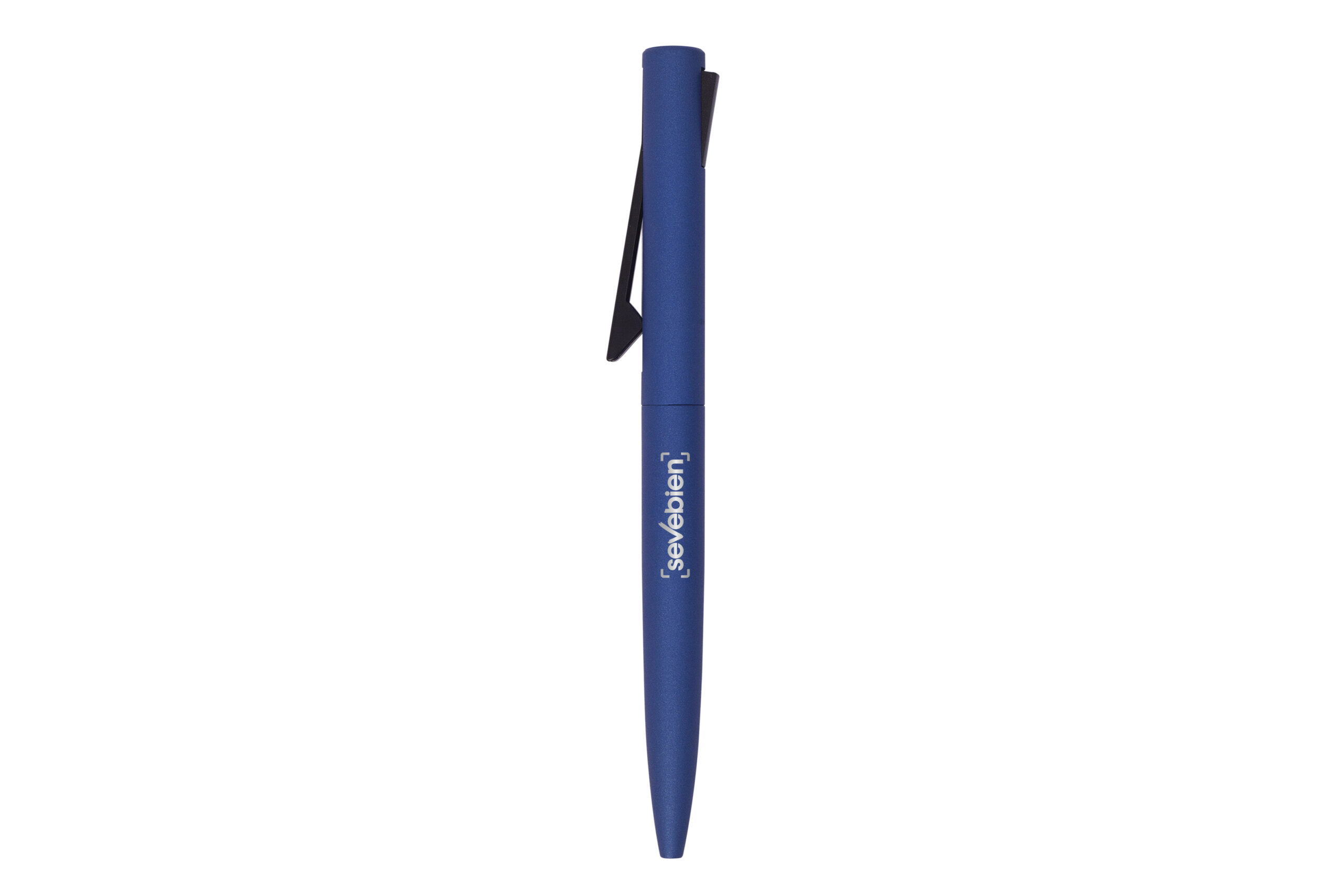 Metal. Cuerpo en metal, parte superior plástica con detalle de color negro. El clip funciona como pulsador. Ideal para imprimir en tampografia. Tinta azul.