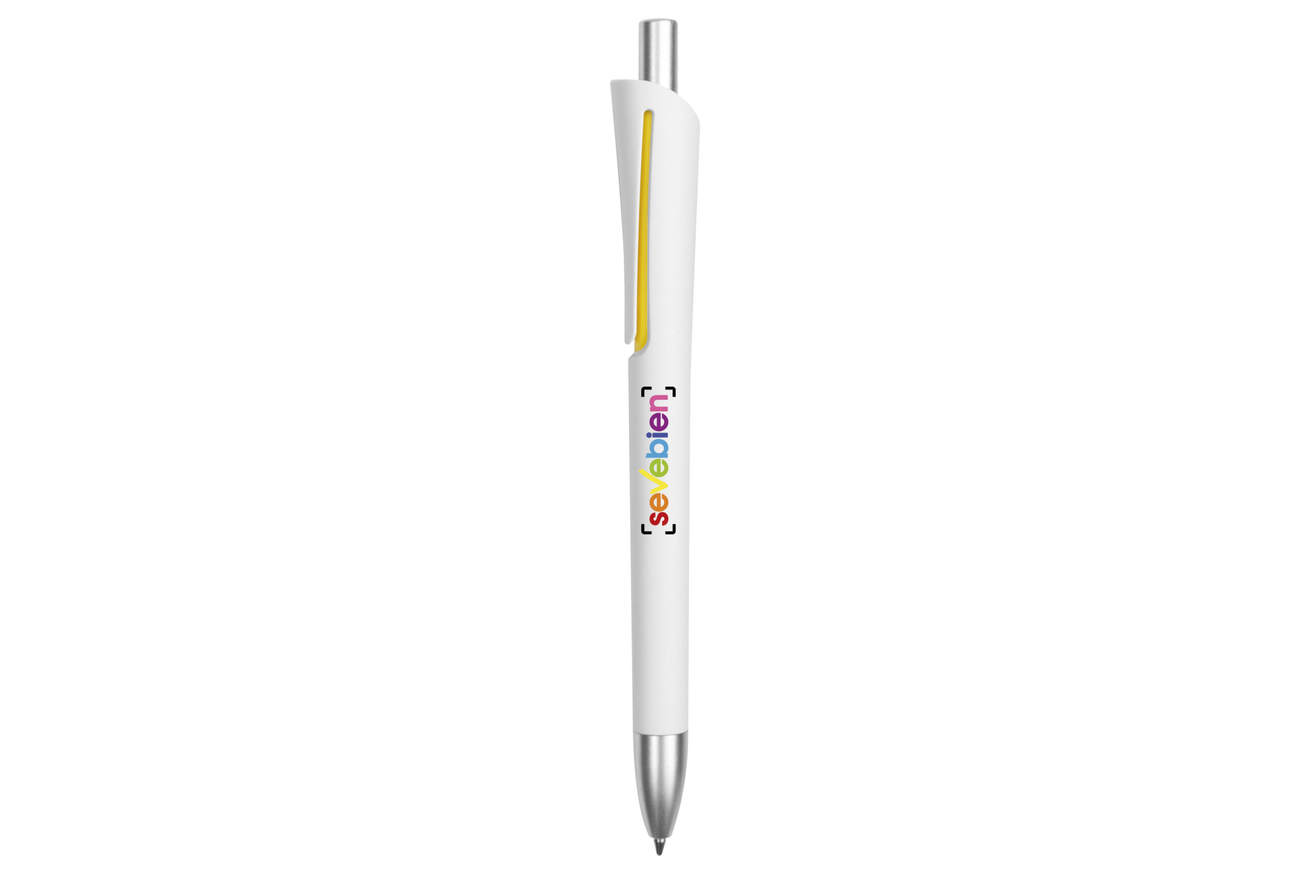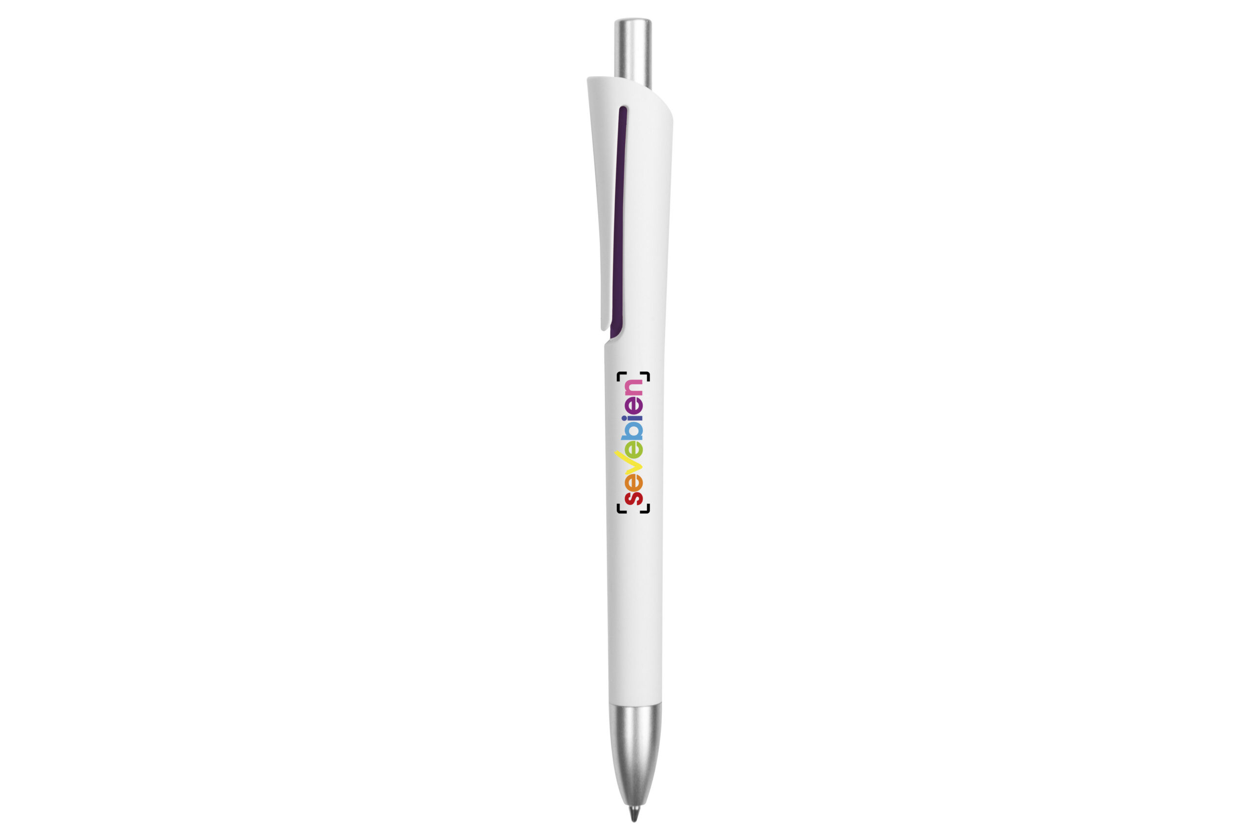 Plástico. Cuerpo blanco mate. Clip, punta y pulsador color plata. Debajo del clip detalle de color. Tinta azul.
