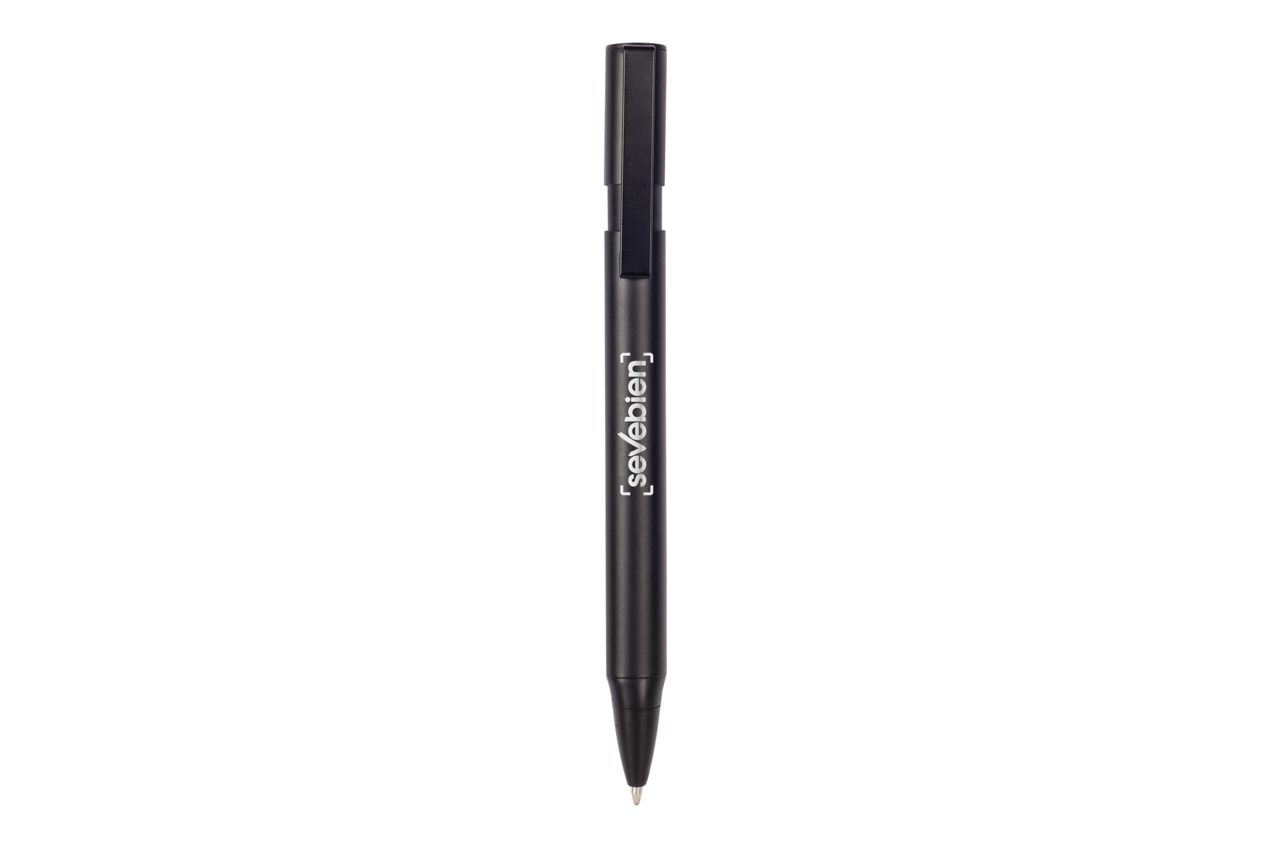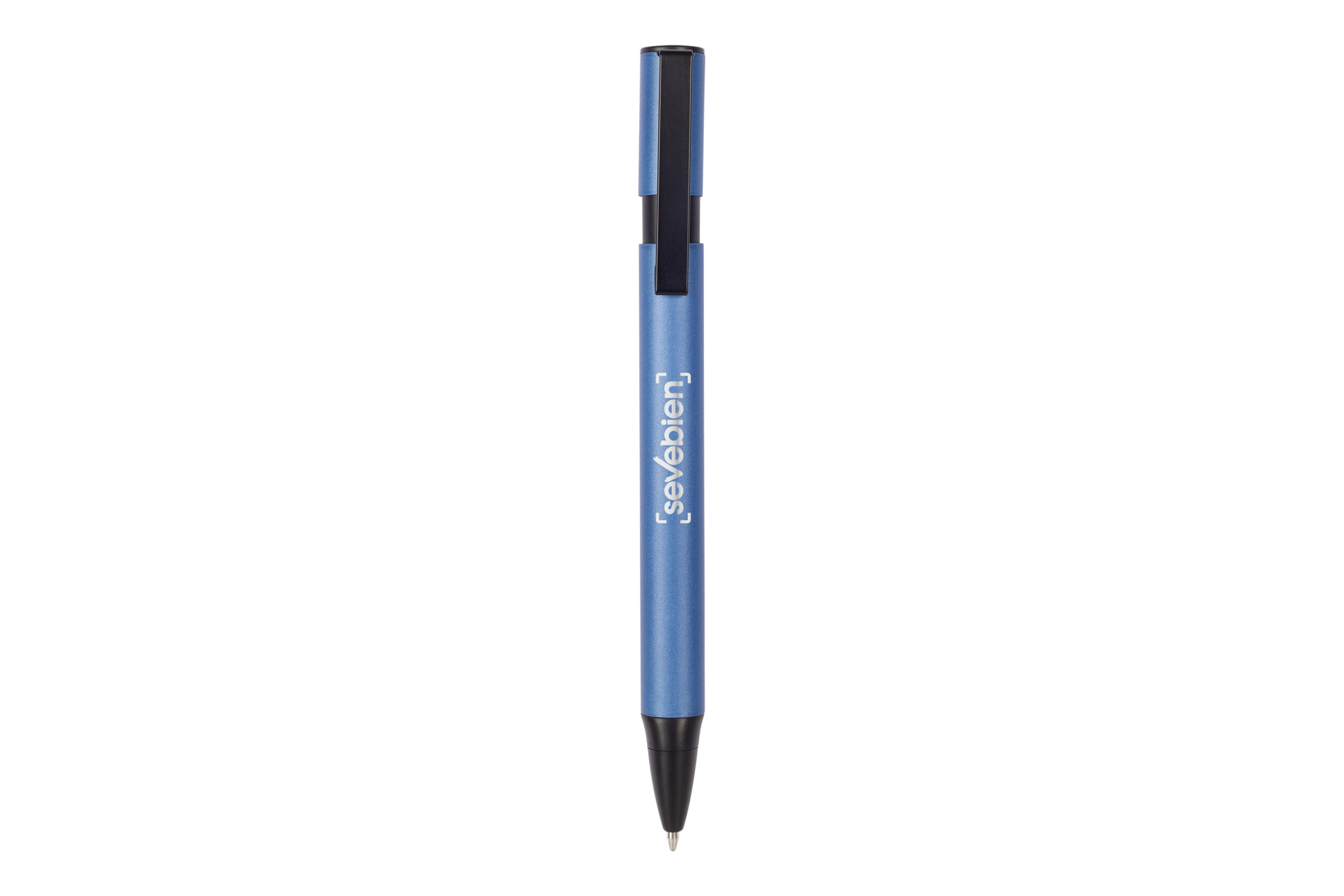 Metal. Formato ovalado. Cuerpo de color. Puntera, clip y pulsador de plástico negro. Tinta azul.
