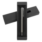 Metal. Cuerpo color plata con detalles, capuchon con clip plata brillante. Tinta gel color negra. Decape color plata. Presentación en caja de regalo.