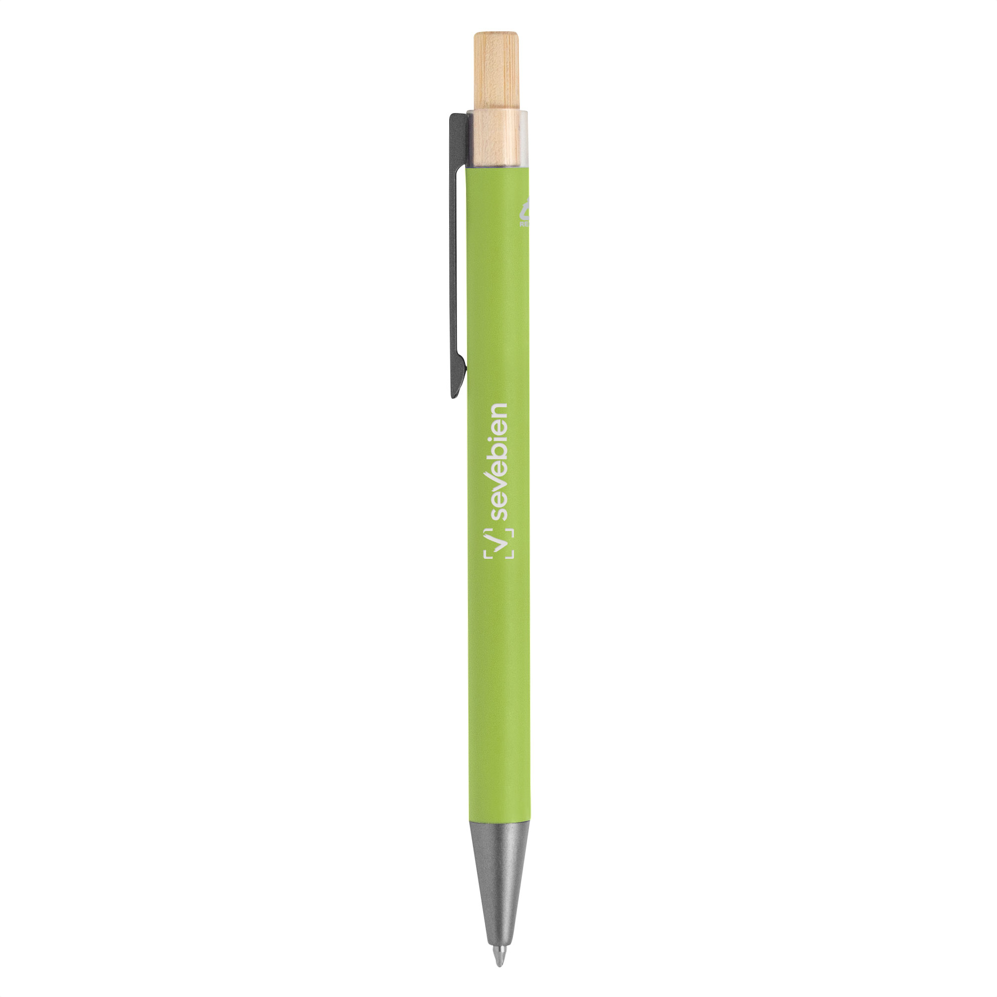 Elegancia y sostenibilidad. Bolígrafo retráctil. Cuerpo metálico en diferentes colores acabado mate. Clip metálico y puntera plástica color gris acabado mate. Pulsador de bambú.Medidas: 14 cm.
