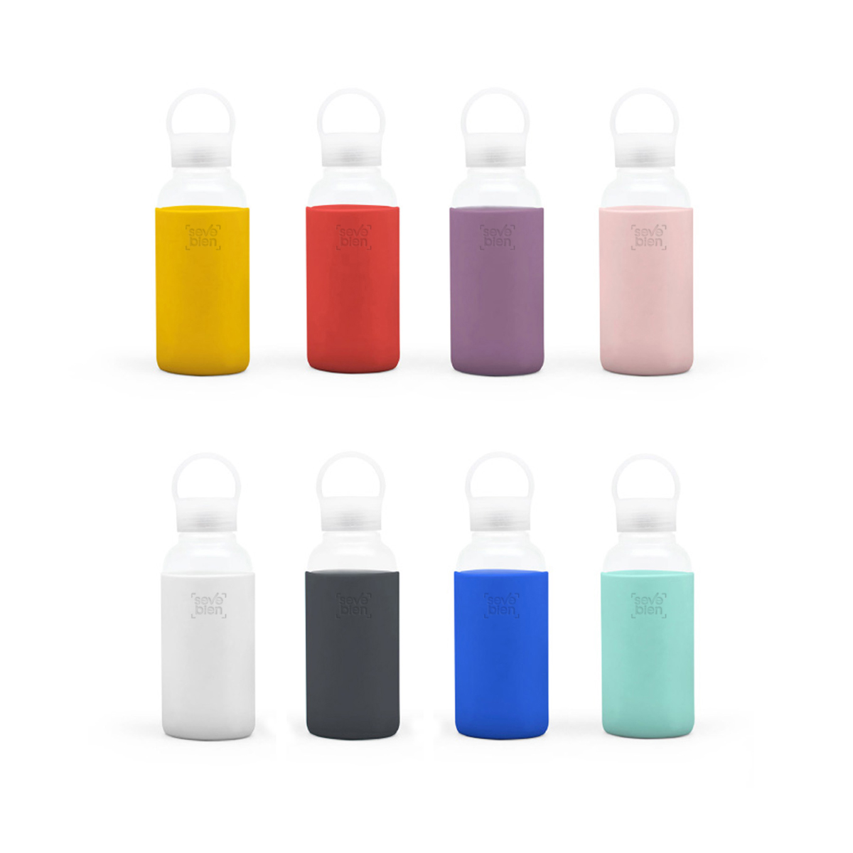 Ø 6,5 x 20 cm. Capacidad 350 ml. Vidrio de borosilicato. Botella práctica y reutilizable. Posee manga de silicona antideslizante en varios colores y pico ancho. Tapa a rosca, antiderrame y con manija de agarre. Presentación en caja de regalo.