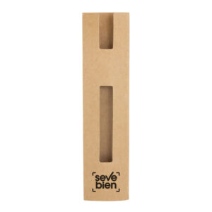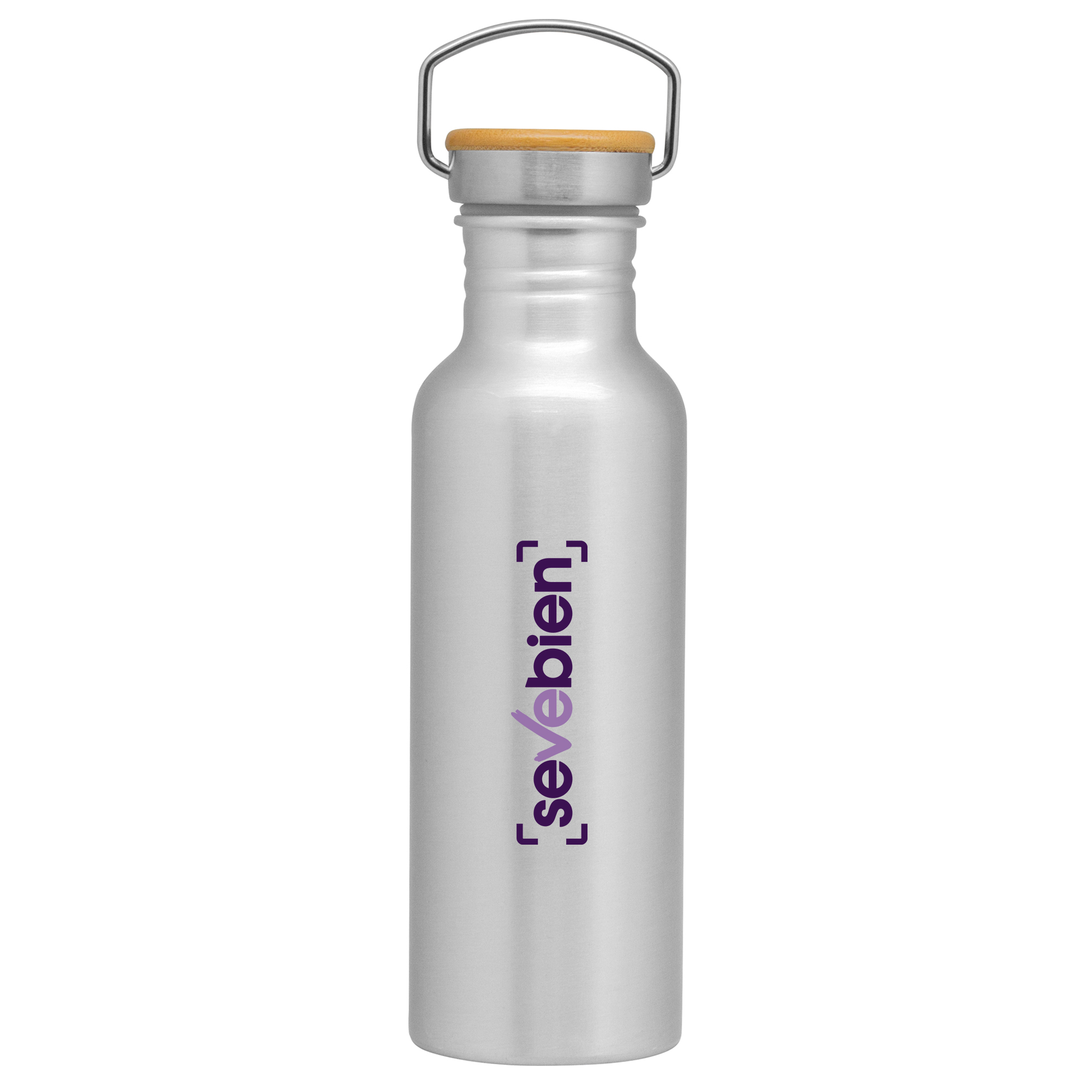 Ø 7,3 x 24 cm. Capacidad 750 ml. Aluminio. Tapa de acero con manija metálica rebatible y detalles en bambú. Anillo de silicona antiderrame. Presentación en caja de regalo Kraft