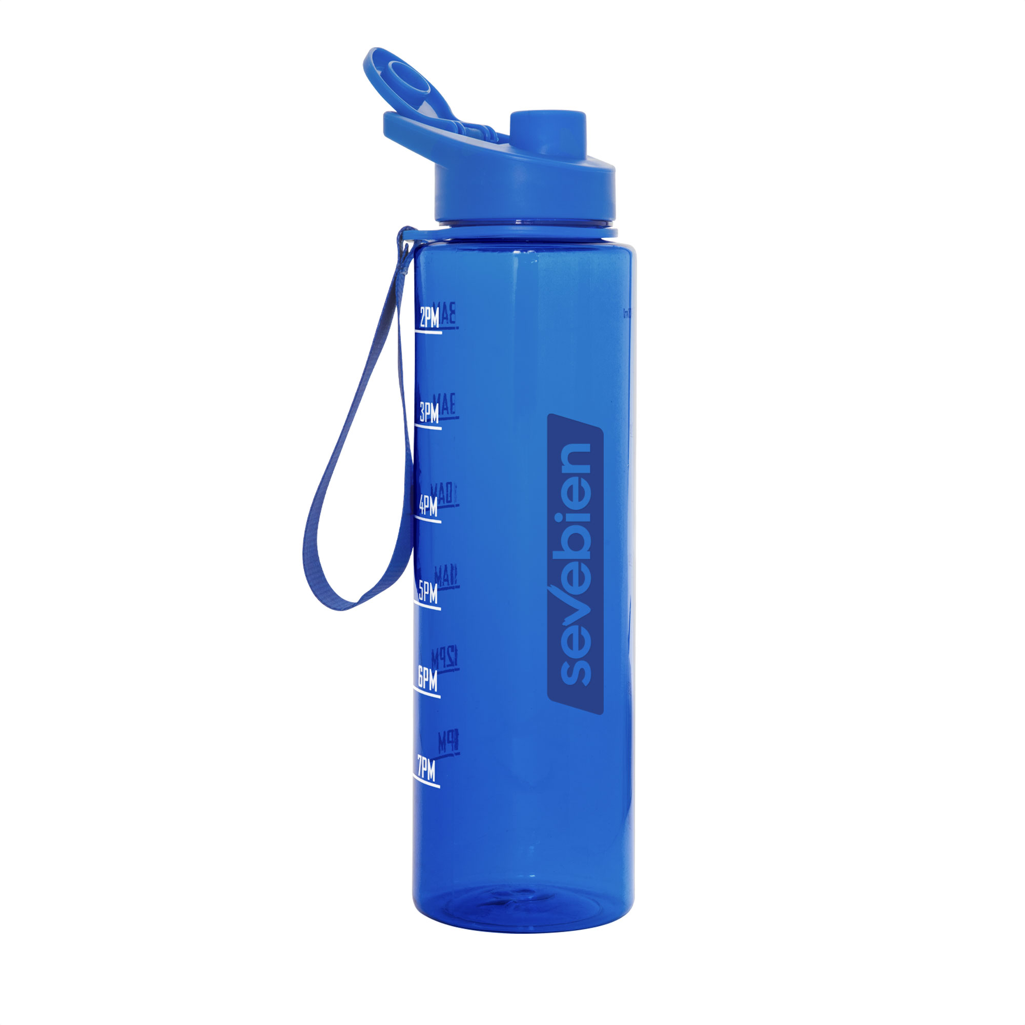 Tu meta en cada sorbo.Botella con marcador de tiempo y medida. Color translúcido con tapa plástica flip top con asa, boquilla y correa del mismo color de la botella.Medidas: Ø 7,5 x 27,5 cm. (con tapa)