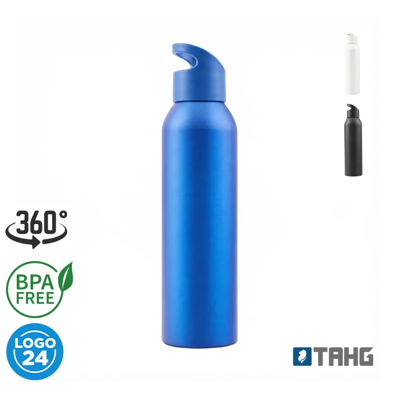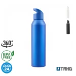 Sport Bottle reutilizable de aluminio con tapa rosca de PP y silicona. Cuenta con una tapa con agarre para facilitar su transporte.