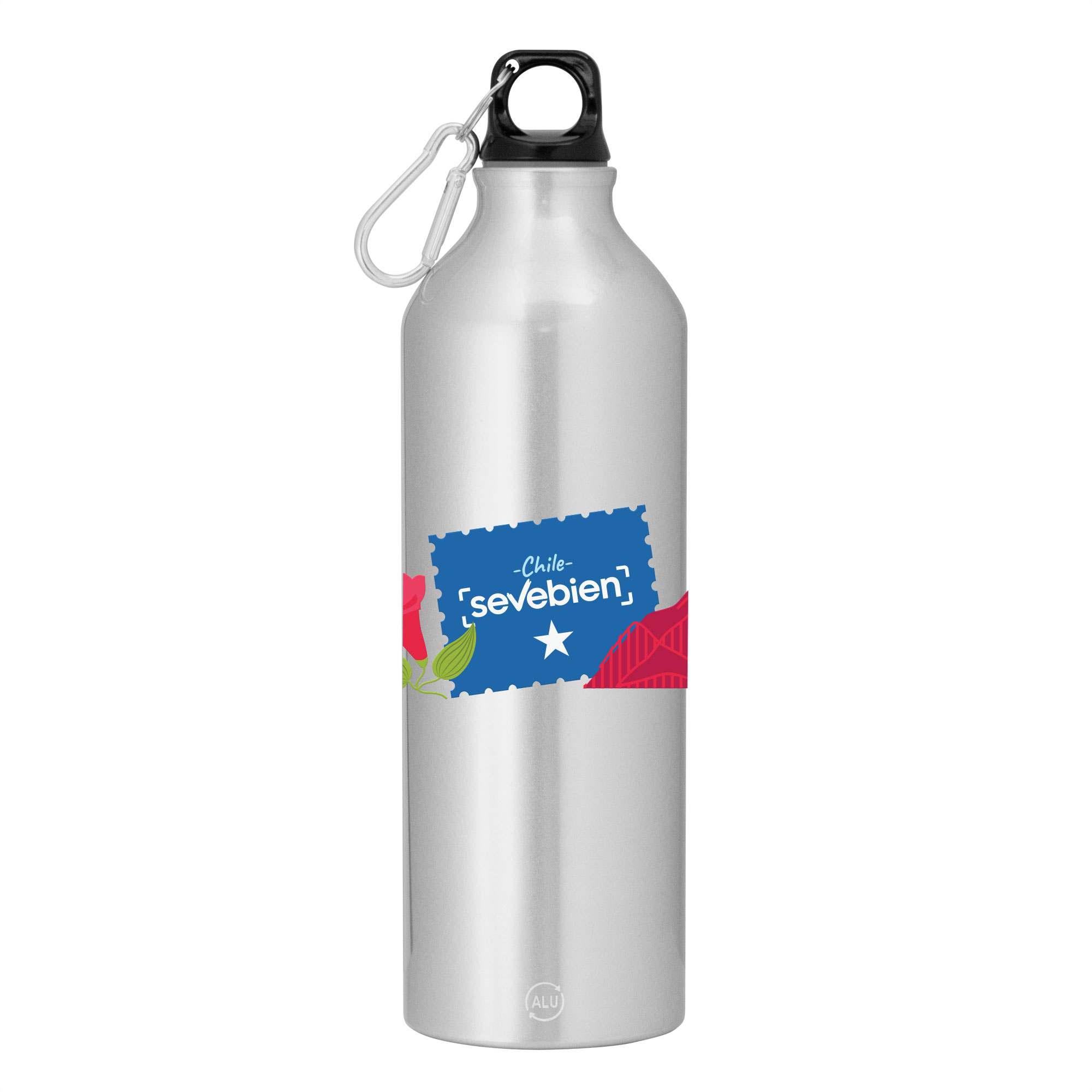 Fácil de llevar a todas partes.Botella de aluminio reciclado. Tapa a rosca plástica con anillo de silicona y con mosquetón (gancho carabinero) en color plateado.Medidas: Ø 7,2 x 25,5 cm.