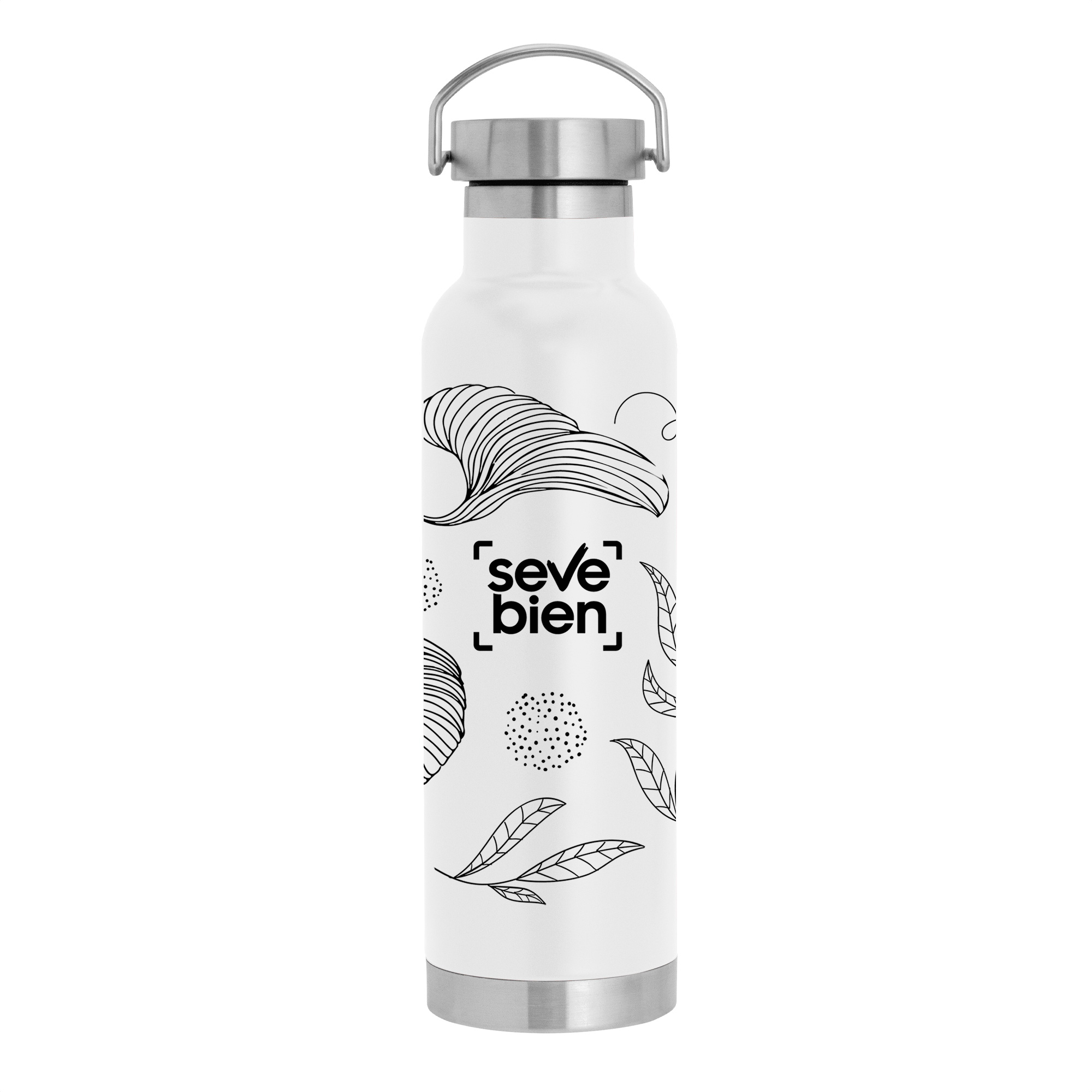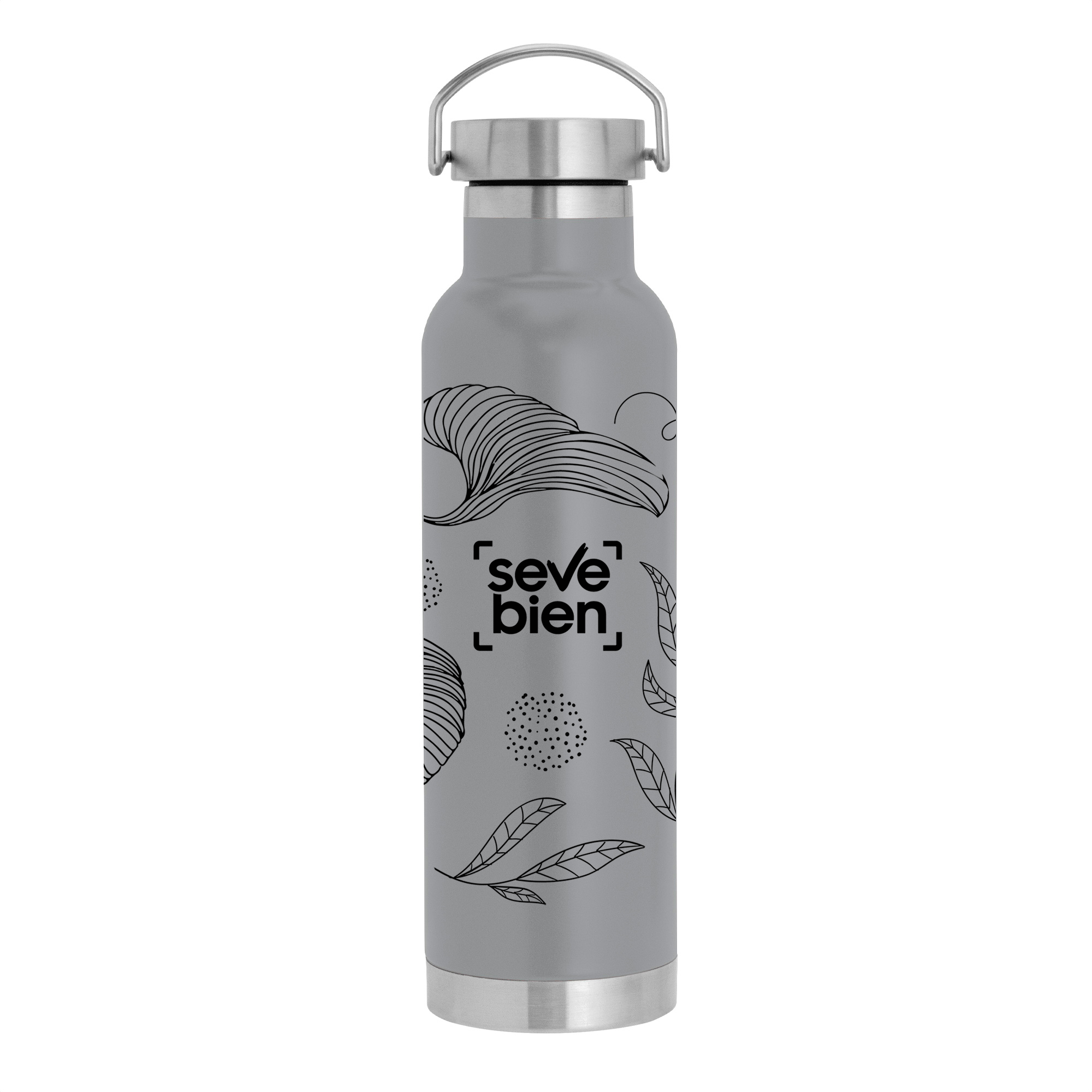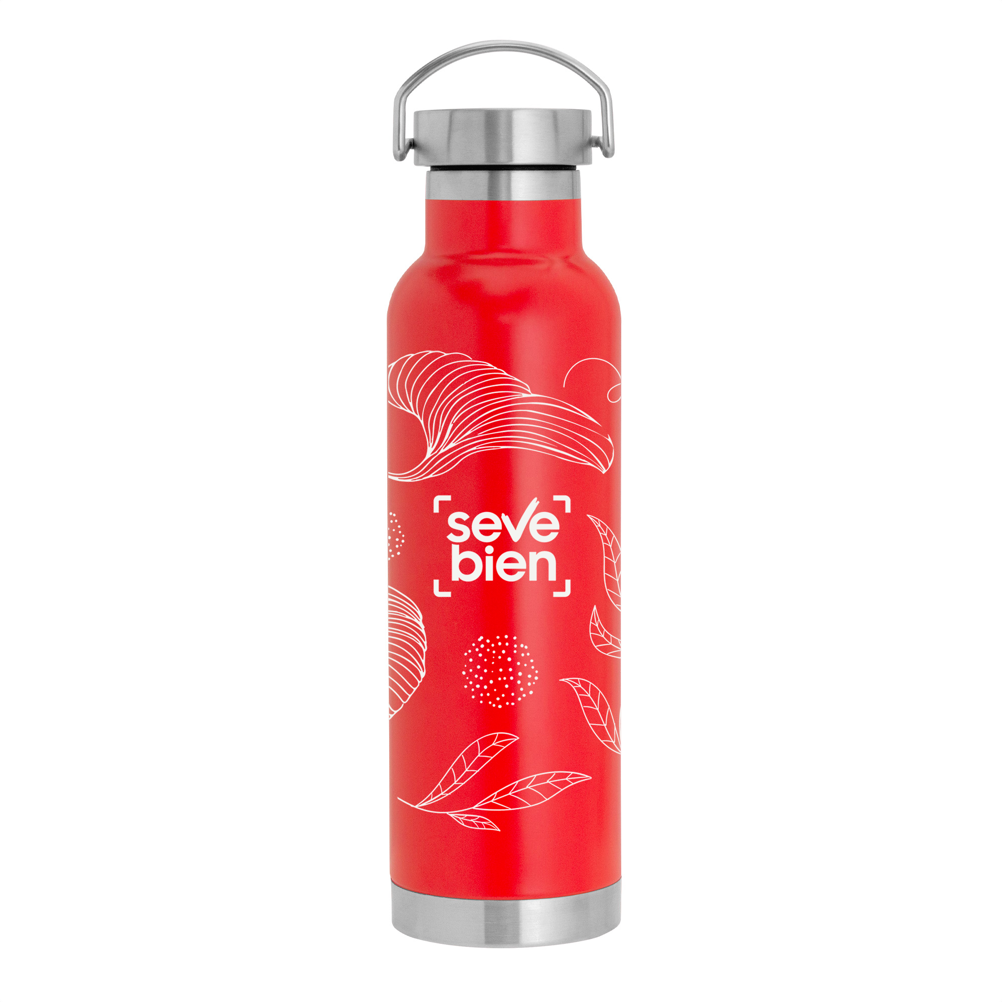Ø 7,3 x 26 cm. Capacidad 650 ml. Acero inoxidable. Botella doble pared, sellada al vacío. Interior en acero 304 y exterior en acero 201. Tapa de acero a rosca con manija rebatible metálica . La medida de este termo es tan practica que con el tendras el liquido necesario para estar hidratado en el momento del día que elijas. Mantiene hasta 12 hs la temperatura de las bebidas calientes y 24 hs de las bebidas frías. Presentación en caja de regalo.