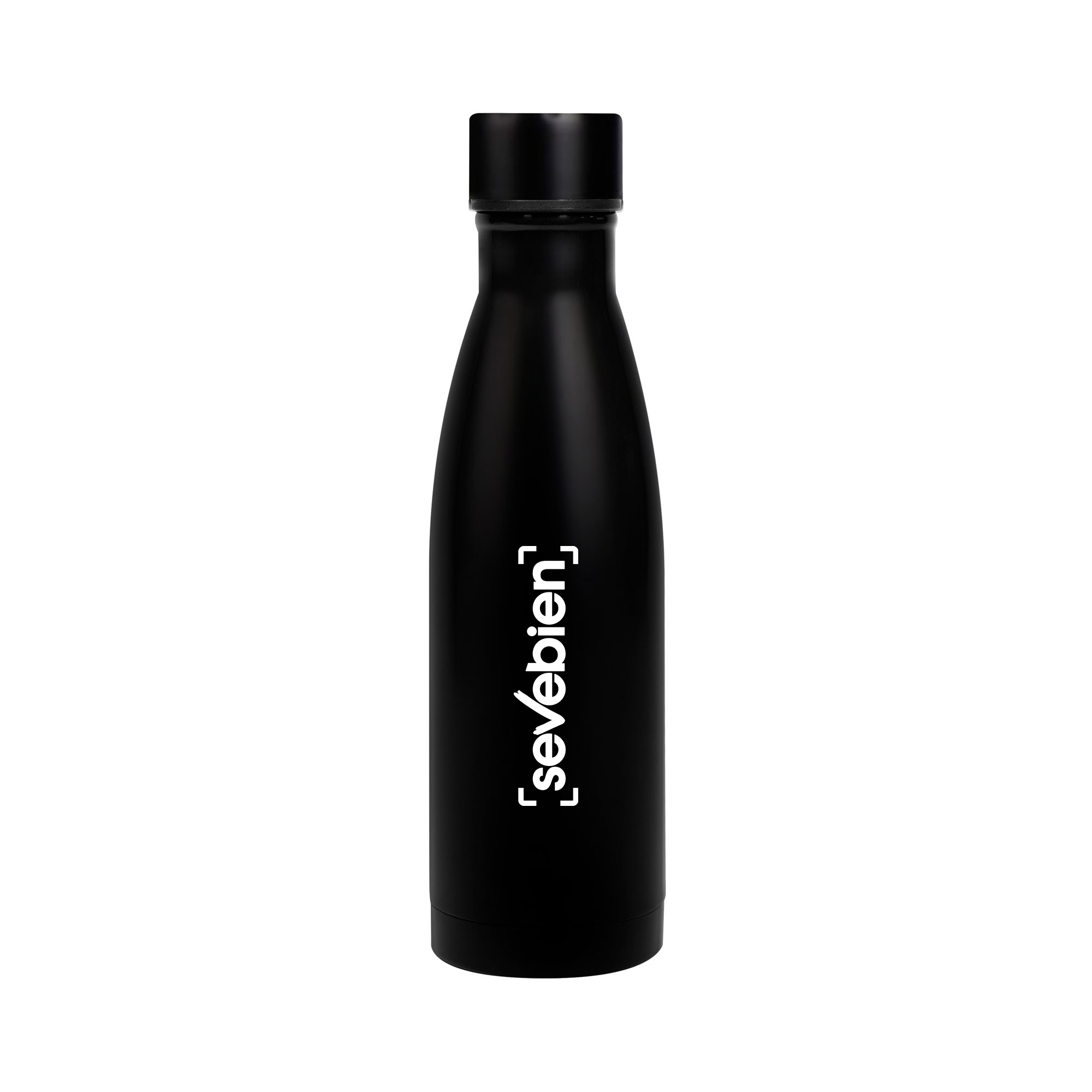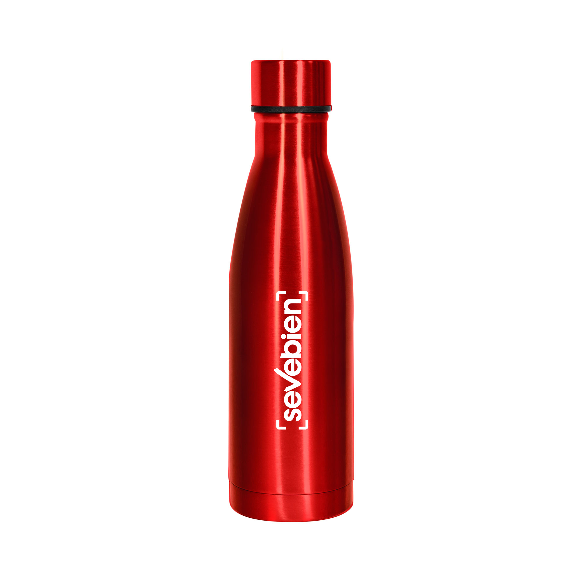 Ø 7 x 25,5 cm. Capacidad 500 ml. Acero inoxidable. Botella doble pared, sellada al vacío. Interior de acero 304 y exterior de acero 201. Cuerpo y tapa a rosca del mismo color. Mantiene hasta 12 hs la temperatura de las bebidas calientes y 24 hs de las bebidas frías. Presentación en caja de regalo.