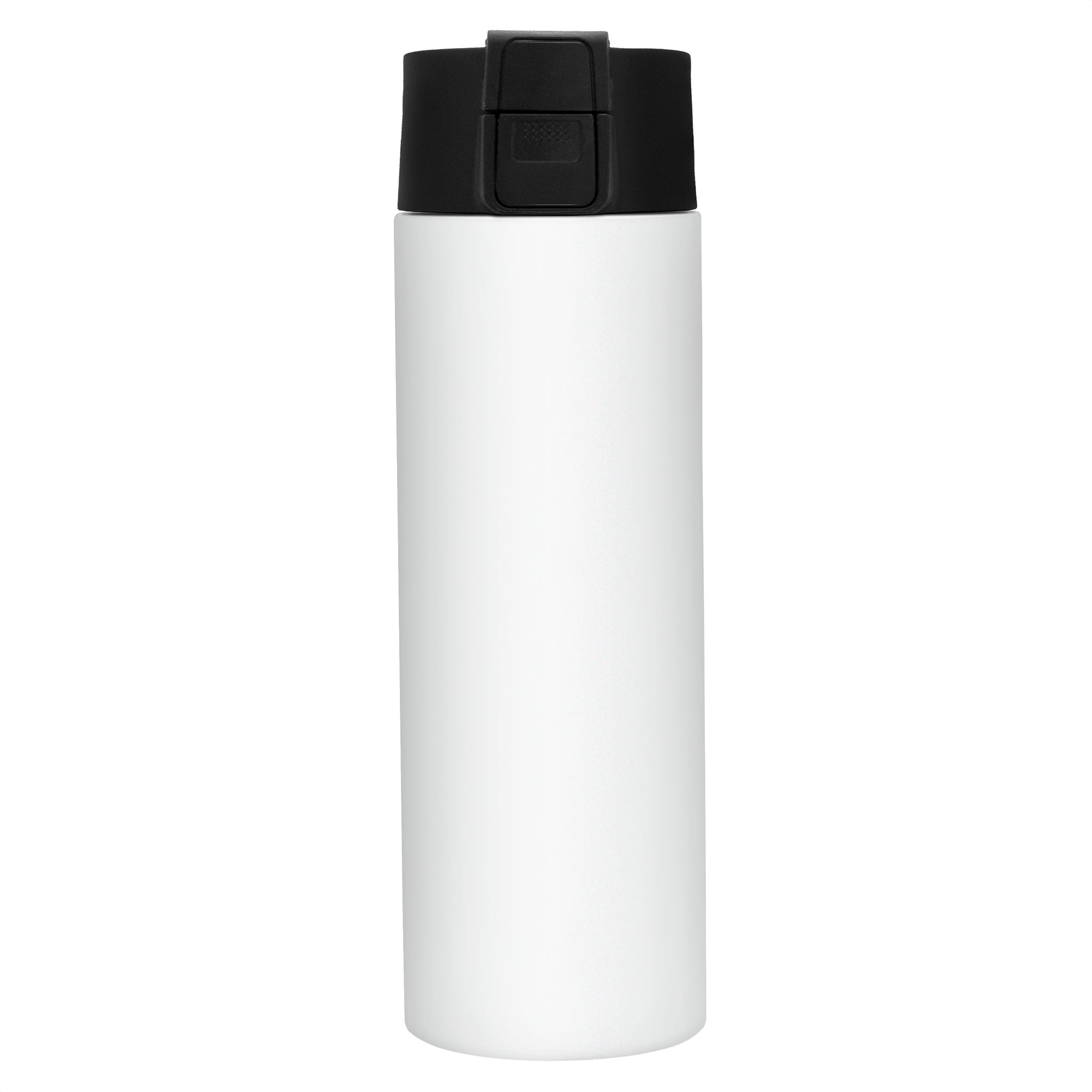 Ø 7 cm x 23 cm. Acero inoxidable. Capacidad 450 ml. Botella doble pared, sellada al vacío. Interior de acero 304 y exterior de acero 201. Pintura color blanco brillante apta para sublimado. Tapa en polipropileno con traba de seguridad y botón pulsador de apertura. Mantiene por más de 12 hs la temperatura de las bebidas calientes y 24 hs de las bebidas frías. Presentación en caja de regalo kraft.