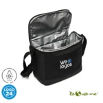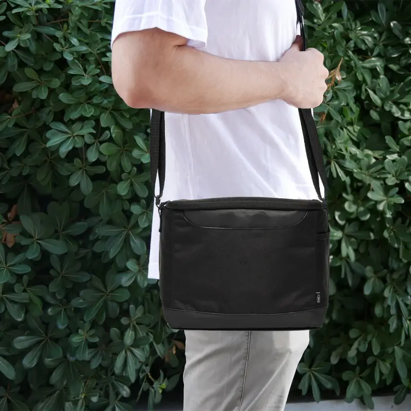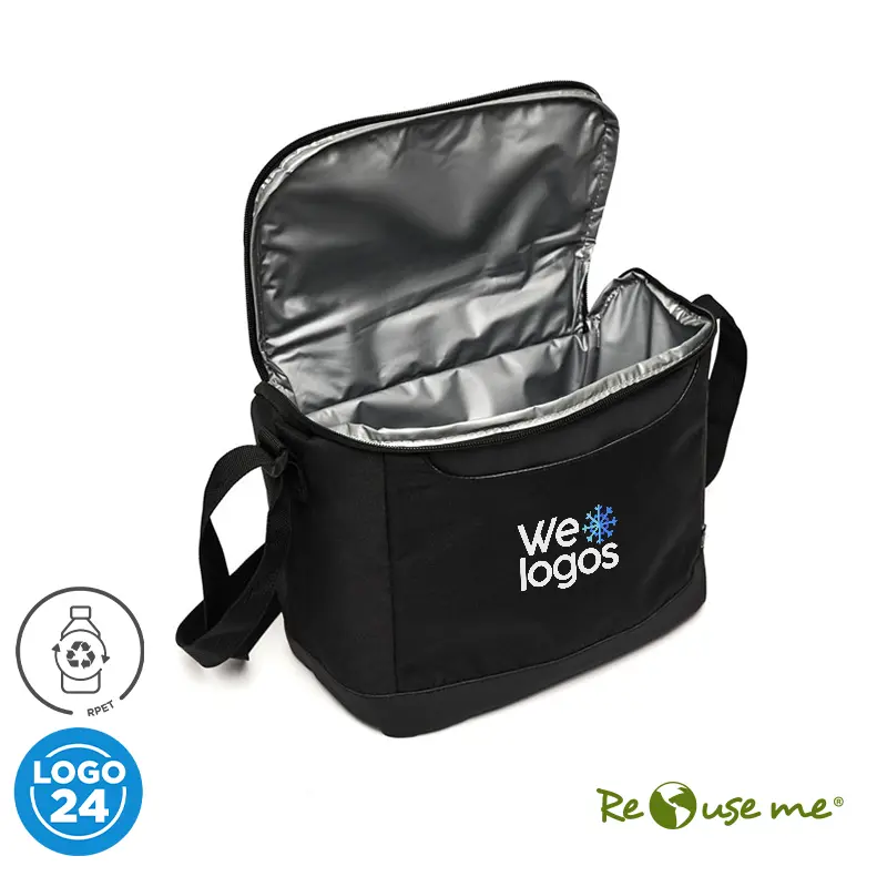 Cooler confeccionado en polyester sustentable RPET, fabricado en base a botellas recicladas. Interior térmico.