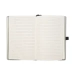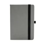 Cuaderno con tapa dura confeccionada en PU (poliuretano) color gris. Cuenta con 96 hojas rayadas de 70 g, perfectas para tomar notas, escribir ideas o planificar la jornada e incluye cinta señaladora.