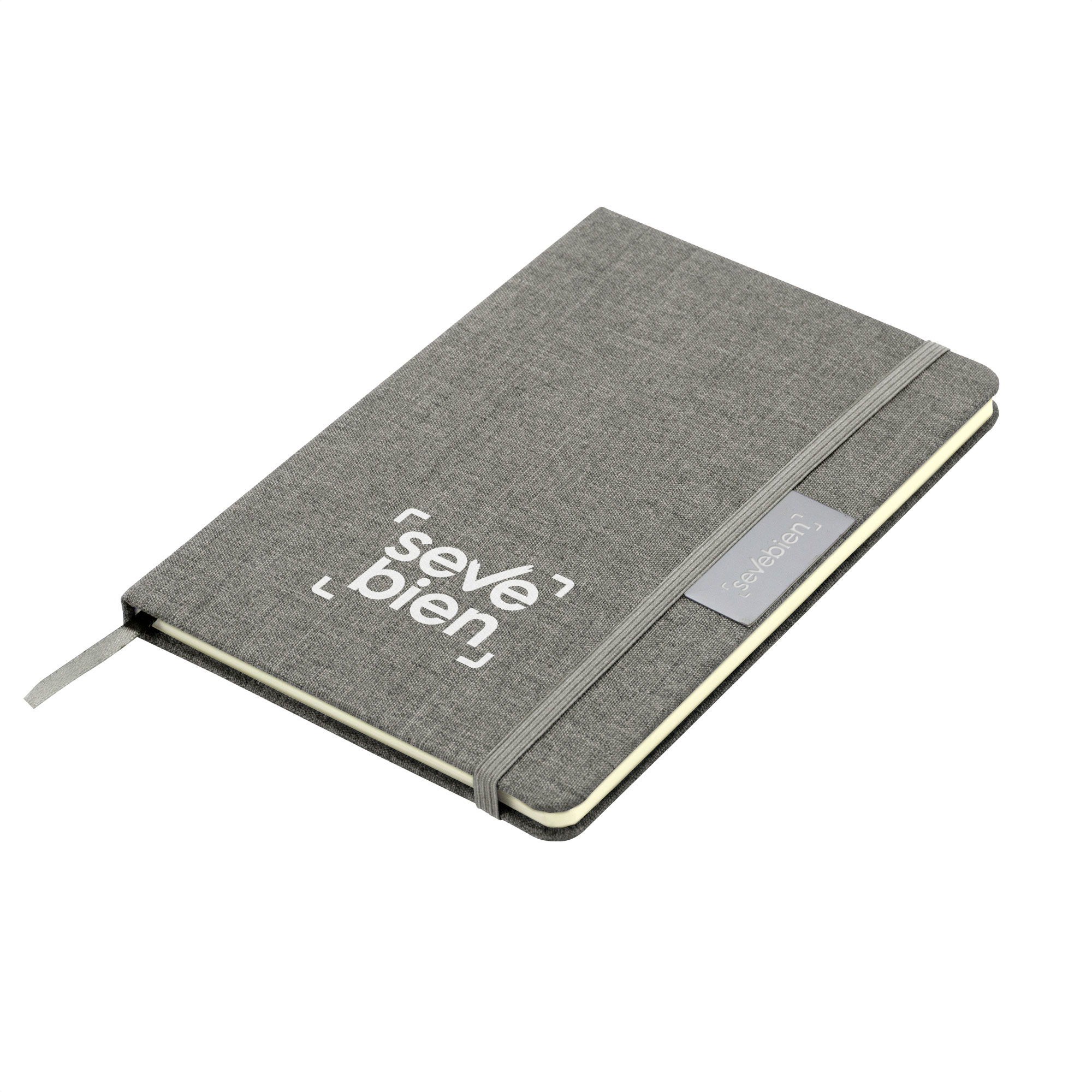 Sostenibilidad elegante.Libreta con placa metálica. Tapa de cartón de 300g recubierta en RPET 310. Placa metálica de 5 x 2 cm. Interior de 80 hojas rayadas en papel obra de 70g. Encuadernación cosida. Cierre con banda elástica del mismo color de la tapa.Medidas: 14 x 21 x 1,5 cm.