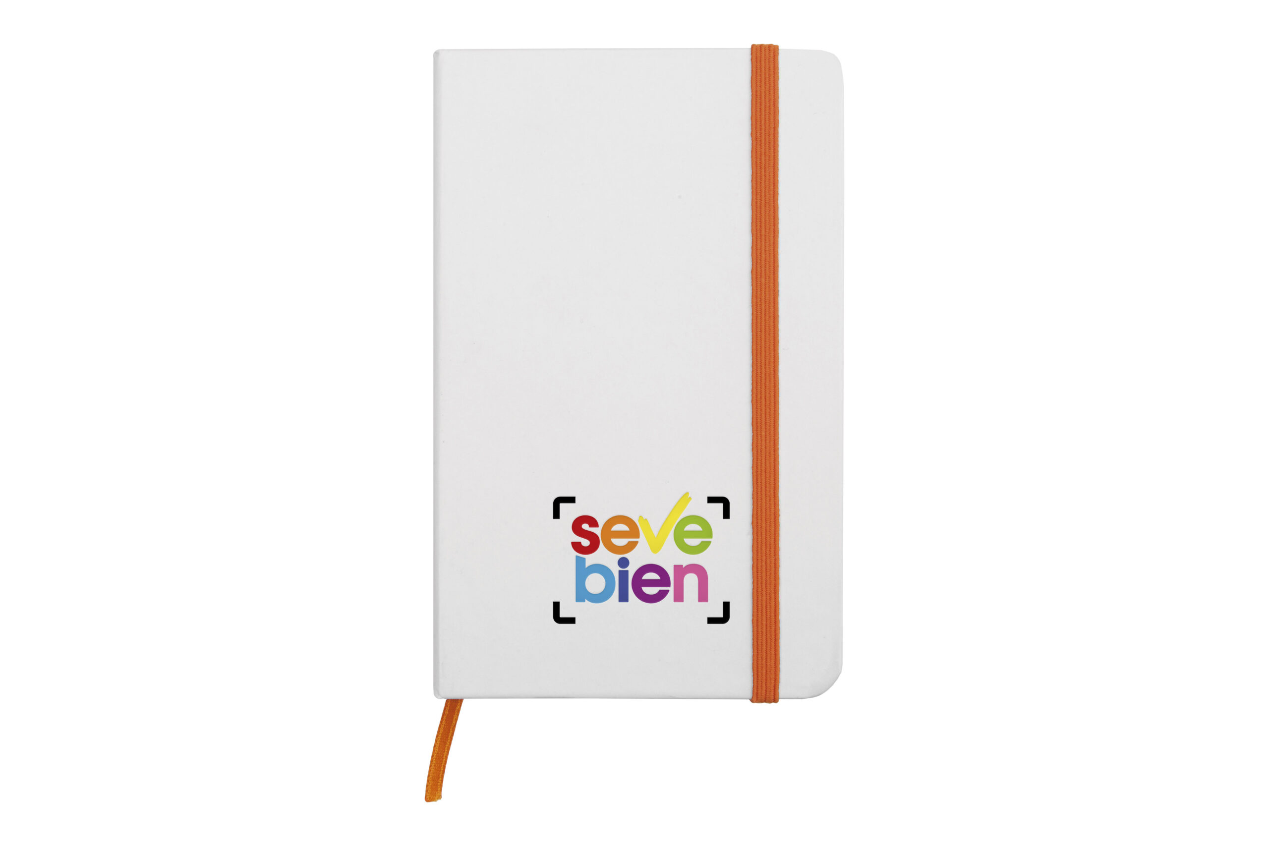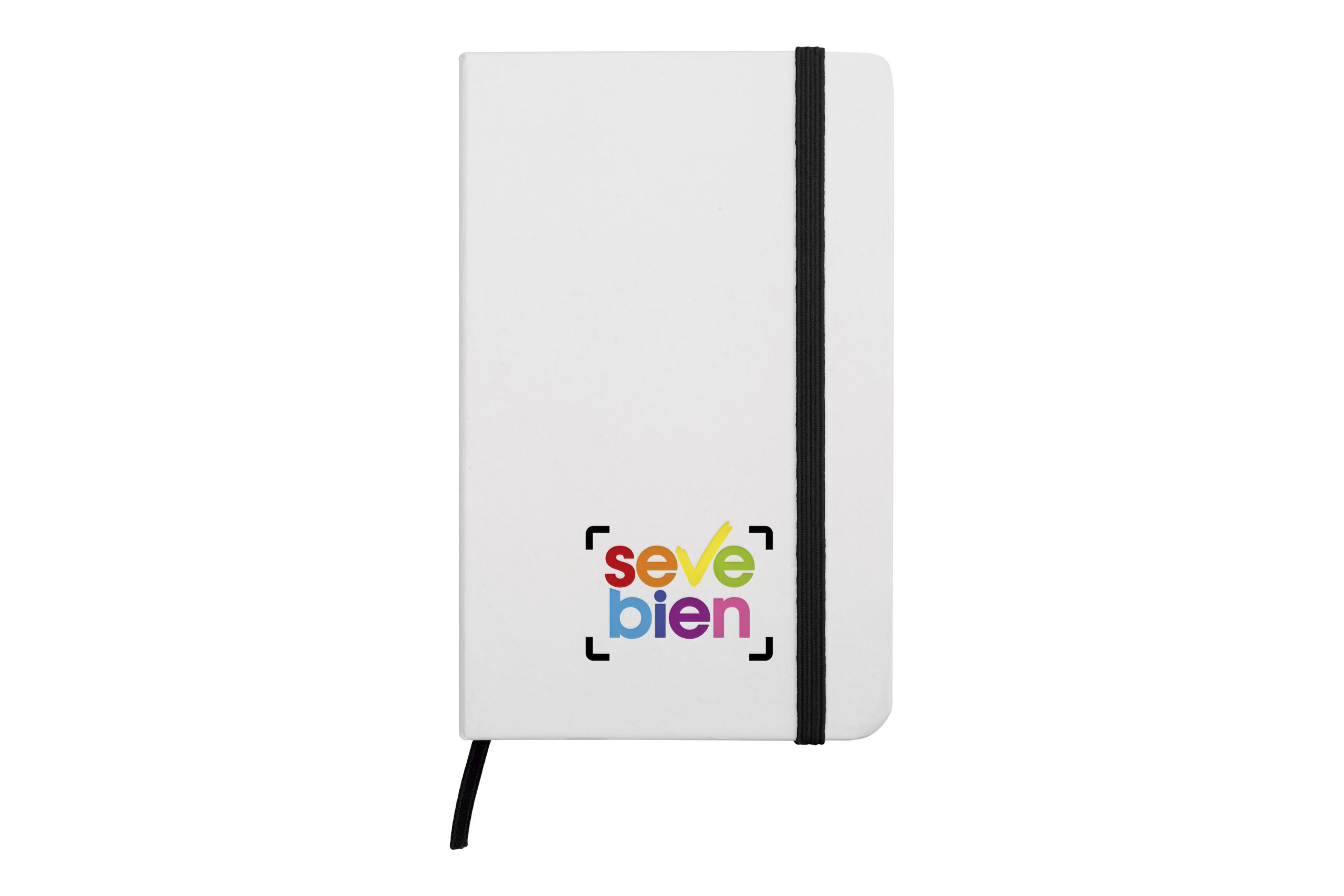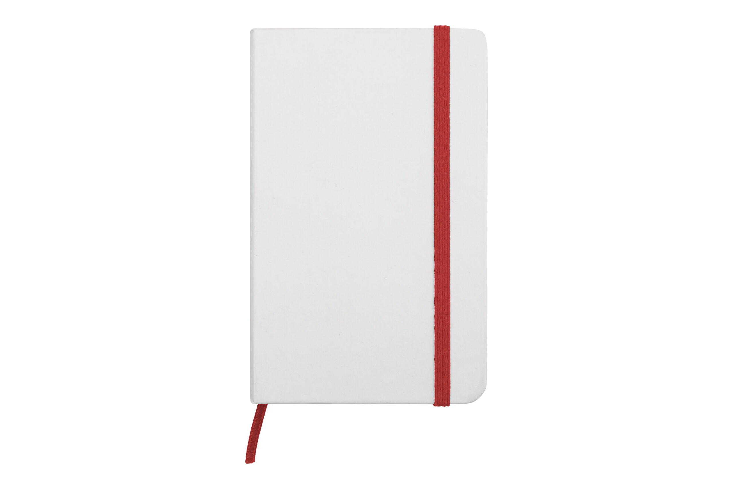 14,3 x 9,2 x 1,1 cm. Cartón. Libreta de tapa dura color blanco. Contiene 80 hojas rayadas, señalador y cierra con banda elástica del mismo color.