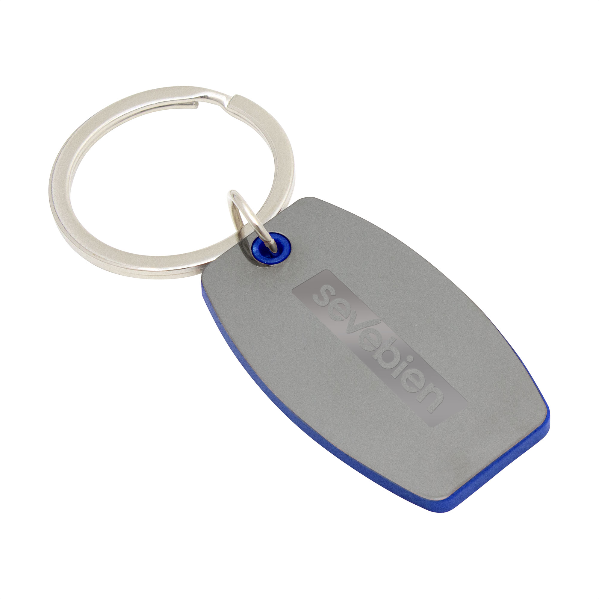 Refleja distinciónLlavero con forma ovalada. Estructura plástica de color con apliques de acero color gris gun de cada lado. Acabado brillante.Medidas: 5 x 3 x 0,35 cm. LLavero de Ø 3,5 cm x 0,2 cm.