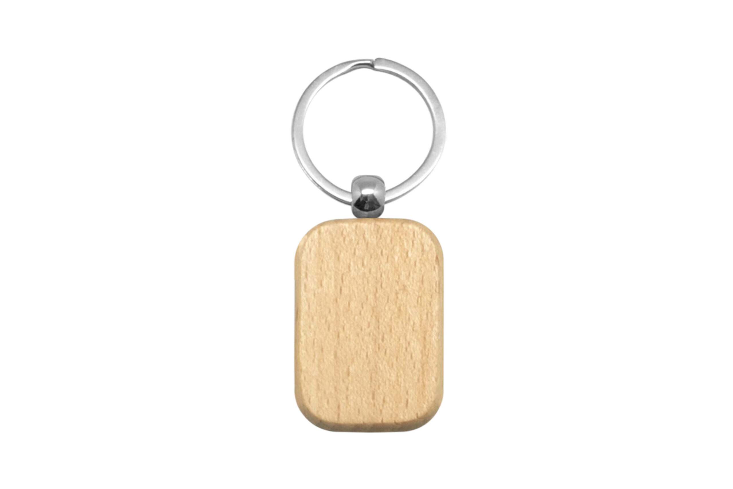 4,2 x 3 x 0,7 cm. (La medida no incluye el aro) Madera. Llavero rectangular con arandela metálica.