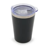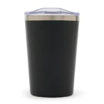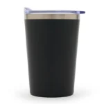 Mug fabricado en acero inoxidable color negro, con tapa antiderrame de acrilonitrilo estireno, garantizando resistencia y durabilidad.