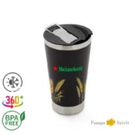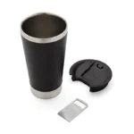 Mug de 600 ml fabricado en doble pared de acero inoxidable, diseñado para mantener la temperatura ideal, ya sea fría o caliente. Su tapa de PP incluye un destapador de botellas, combinando estilo y funcionalidad, perfecto para cualquier ocasión. El producto se presenta en una bolsa de PLA 100% compostable dentro de una caja de cartulina Kraft. Producto libre de BPA, aprobado por el I.N.A.L. para el contacto con alimentos.