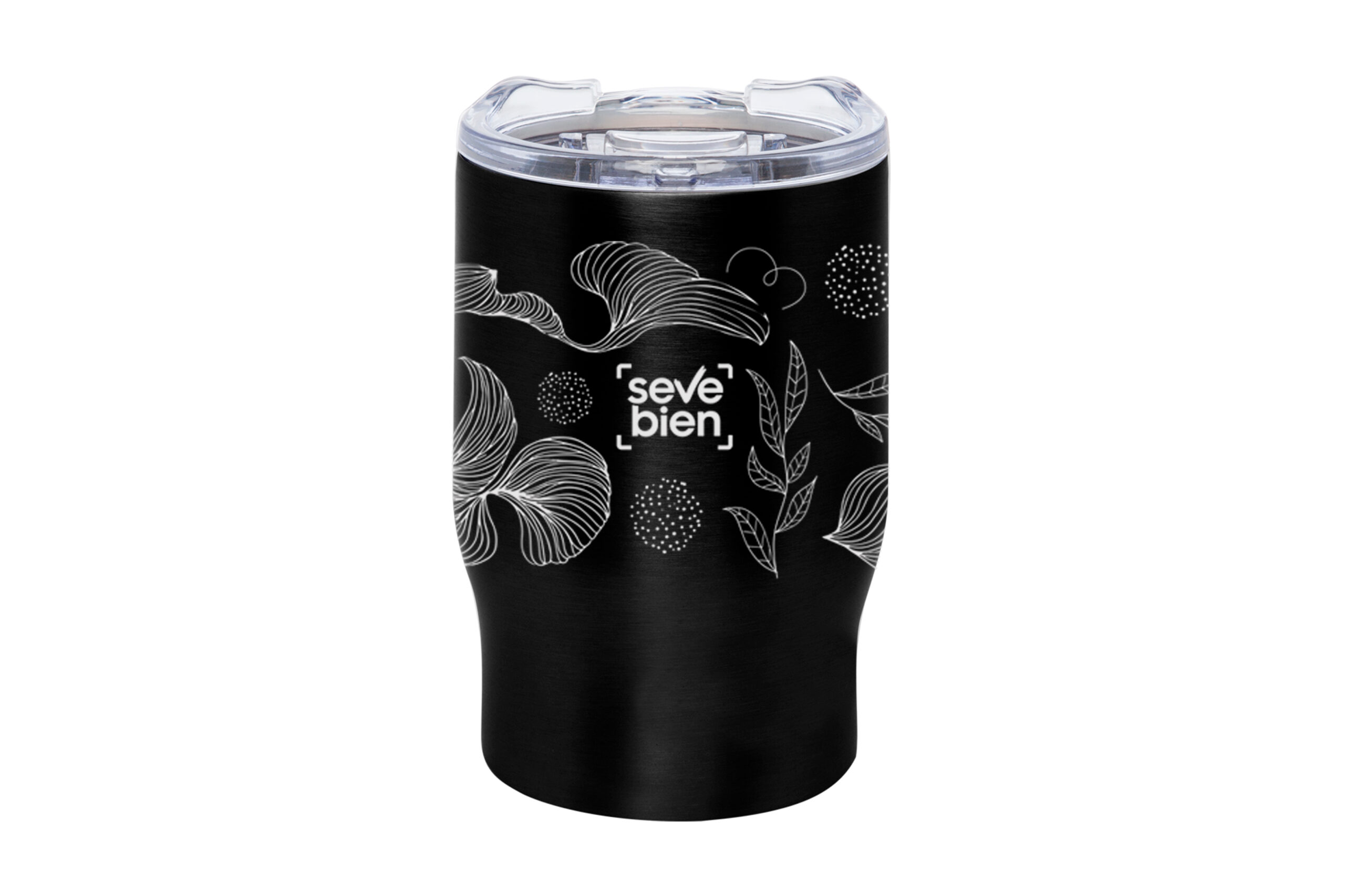 Ø 8,5 x 13,3 cm. Capacidad 350 ml. Acero inoxidable. Mug doble pared. Interior de acero 304 y exterior de acero 201. Tapa plástica transparente a presión con anillo de silicona. Mantienen las bebidas frías y calientes por más tiempo. No utilizar con bebidas gaseosas. Presentación en caja de regalo.
