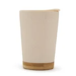 Mug reutilizable fabricado en PP (polipropileno) y bamboo en su base. Su tapa antiderrame proporciona mayor seguridad, evitando accidentes y derrames.
