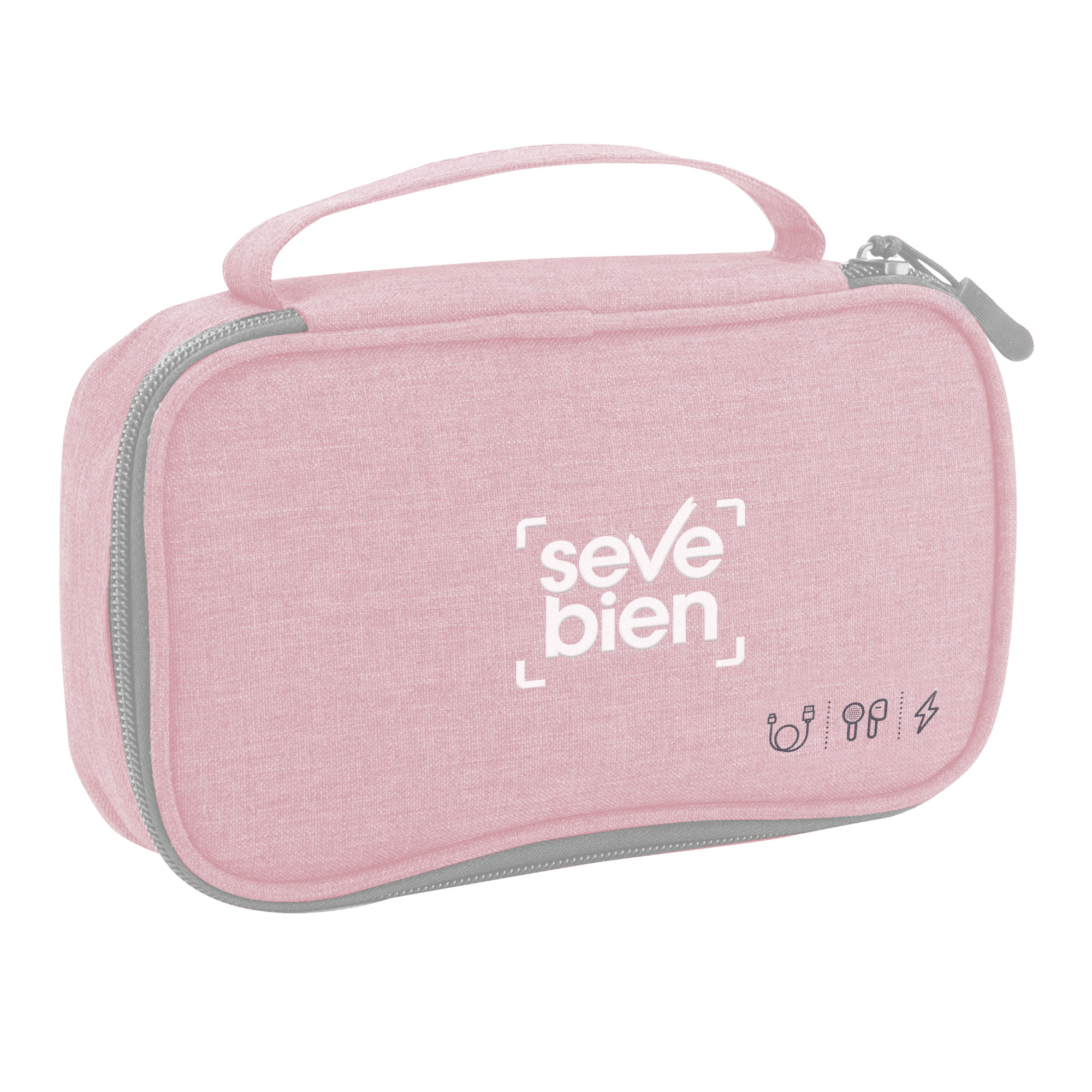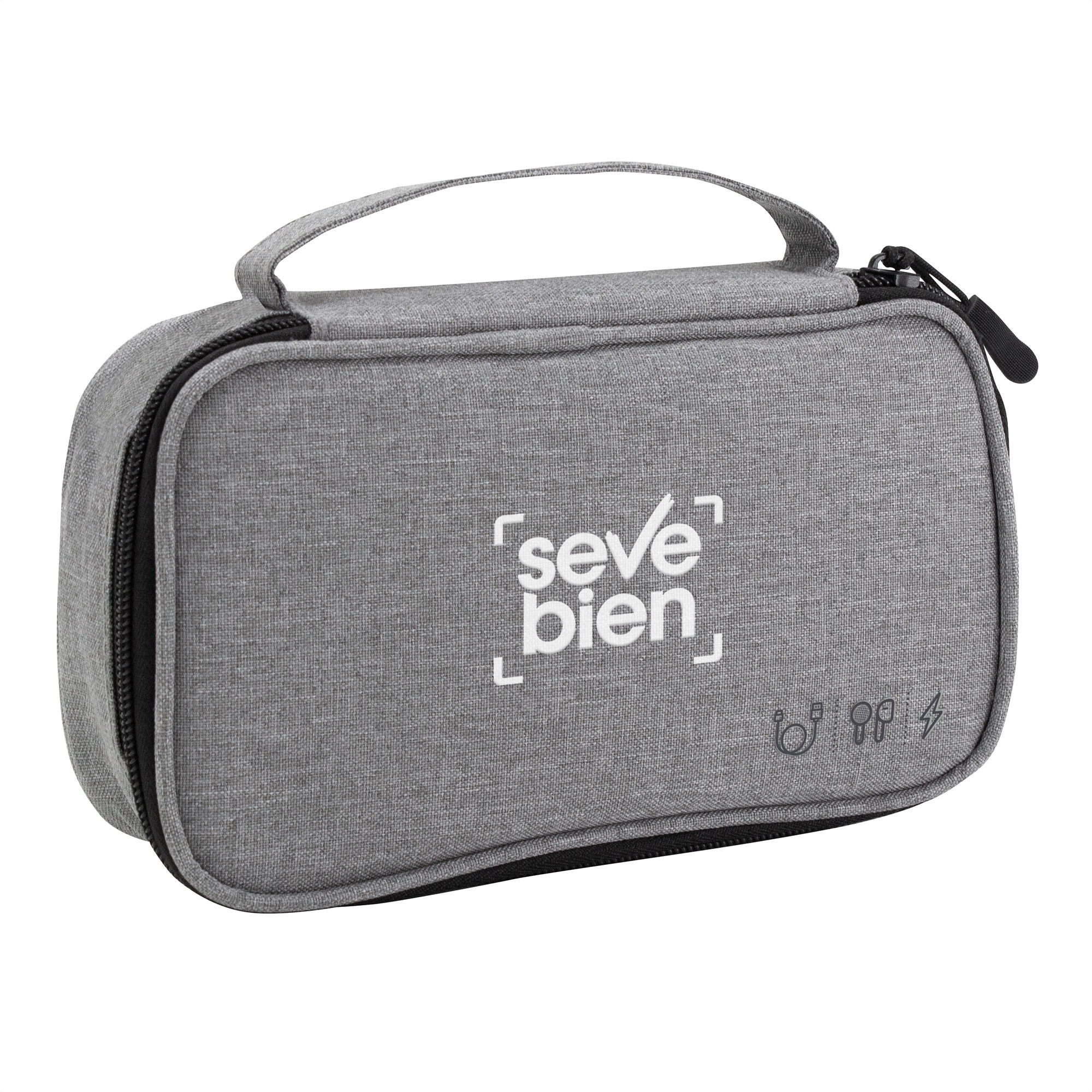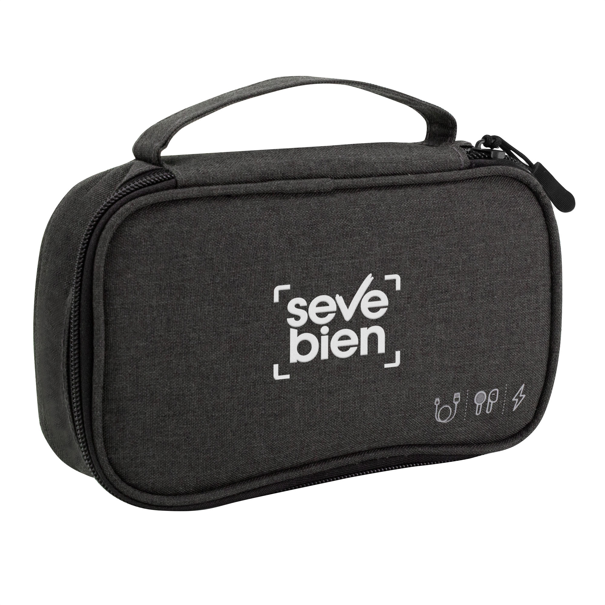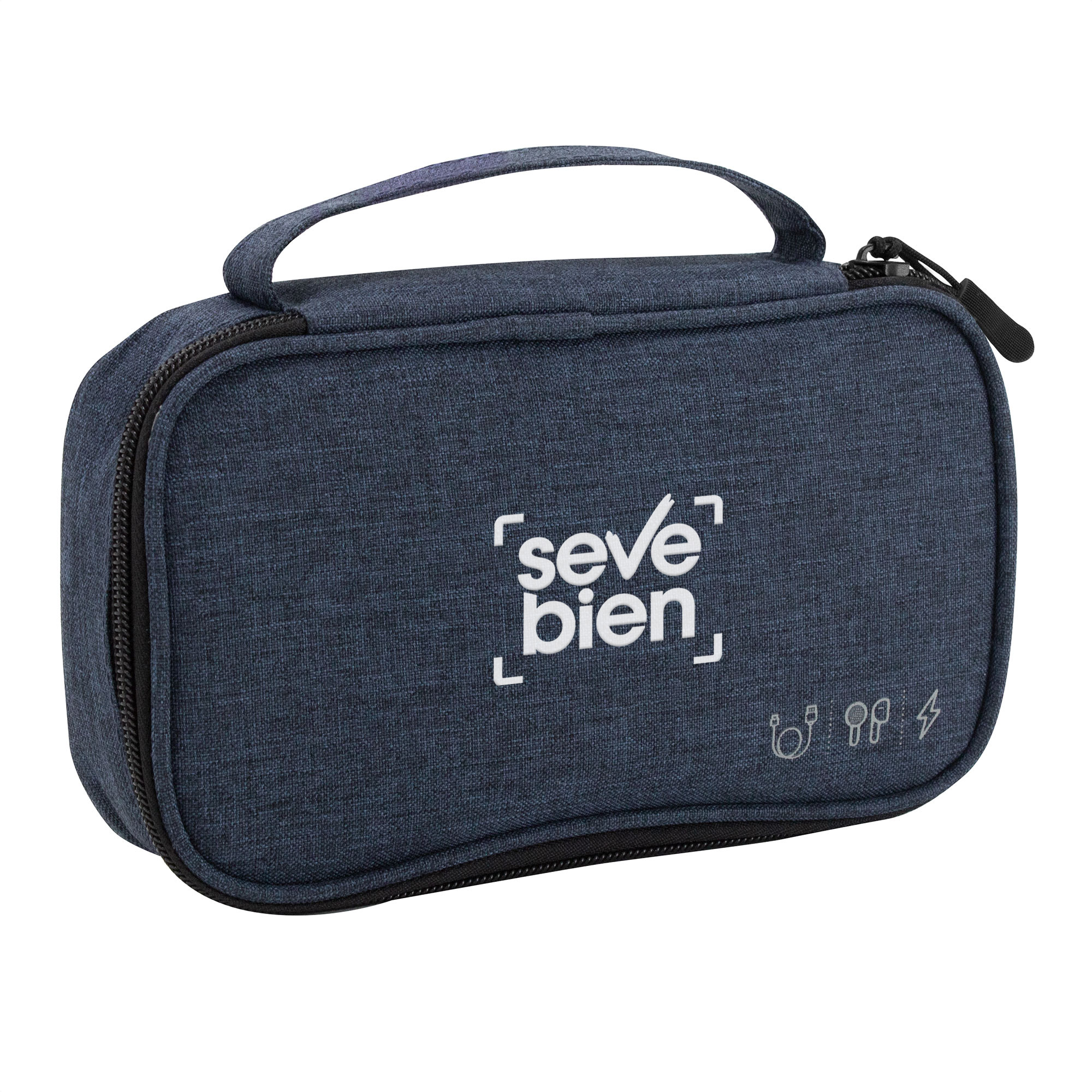 20 x 12 x 5,3 cm. Poliéster 300D. Organizador de cables. Estructura acolchada. Asa para transportar. Compartimento principal con cierre con tirador engomado. Interior forrado. En uno de sus lados cuenta con un bolsillo principal y dos pequeños de red, y en el lado contrario tiene un elástico con velcro multipropósito.