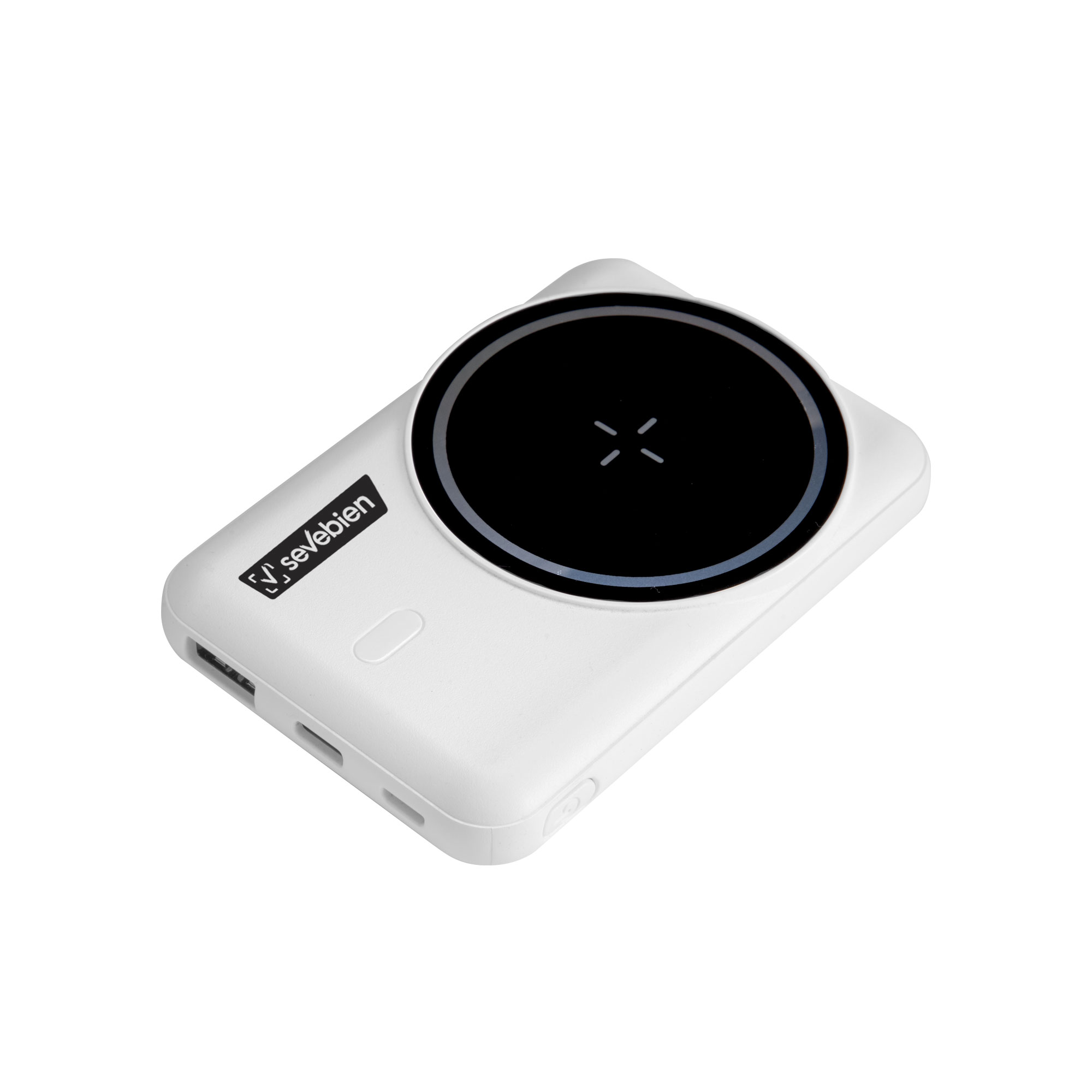 Carga sin cables, estilo sin límitesPower bank inalámbrico con aro magnético y soporte de anillo. Color blanco mate y negro brillante. Posee Entrada y salida: 5V 2A. Con 2 puertos de carga USB-C y micro USB. Función inalámbrica magnética. Potencia inalámbrica: 5W. Indicador luz led de carga. Soporte plateado rebatible al dorso. Cable de carga USB-C de 30 cm. en color blanco. Medidas: 9,4 x 6,4 x 1,6 cm.