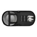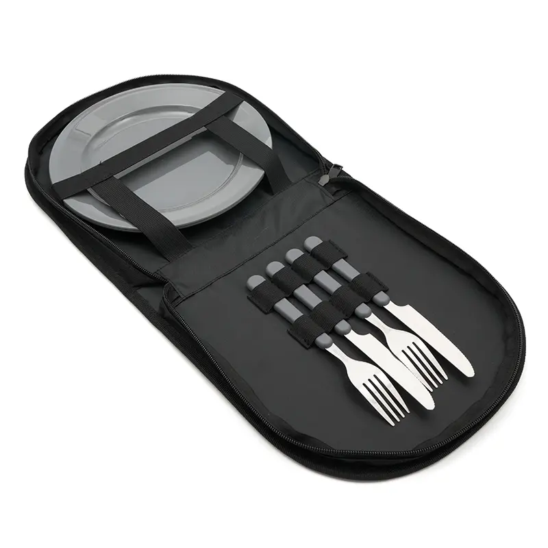 Set de asado con funda organizadora compacta. Hecho en polycanvas de alta calidad, con detalles reforzados y cierre de cremallera resistente. Cuenta con bolsillo frontal, manija superior, espacio para 2 juegos de cubiertos y 2 platos, todo sujeto con bandas elásticas. Es ideal para llevar a picnics, campings o disfrutar un asado al aire libre.