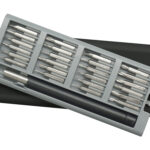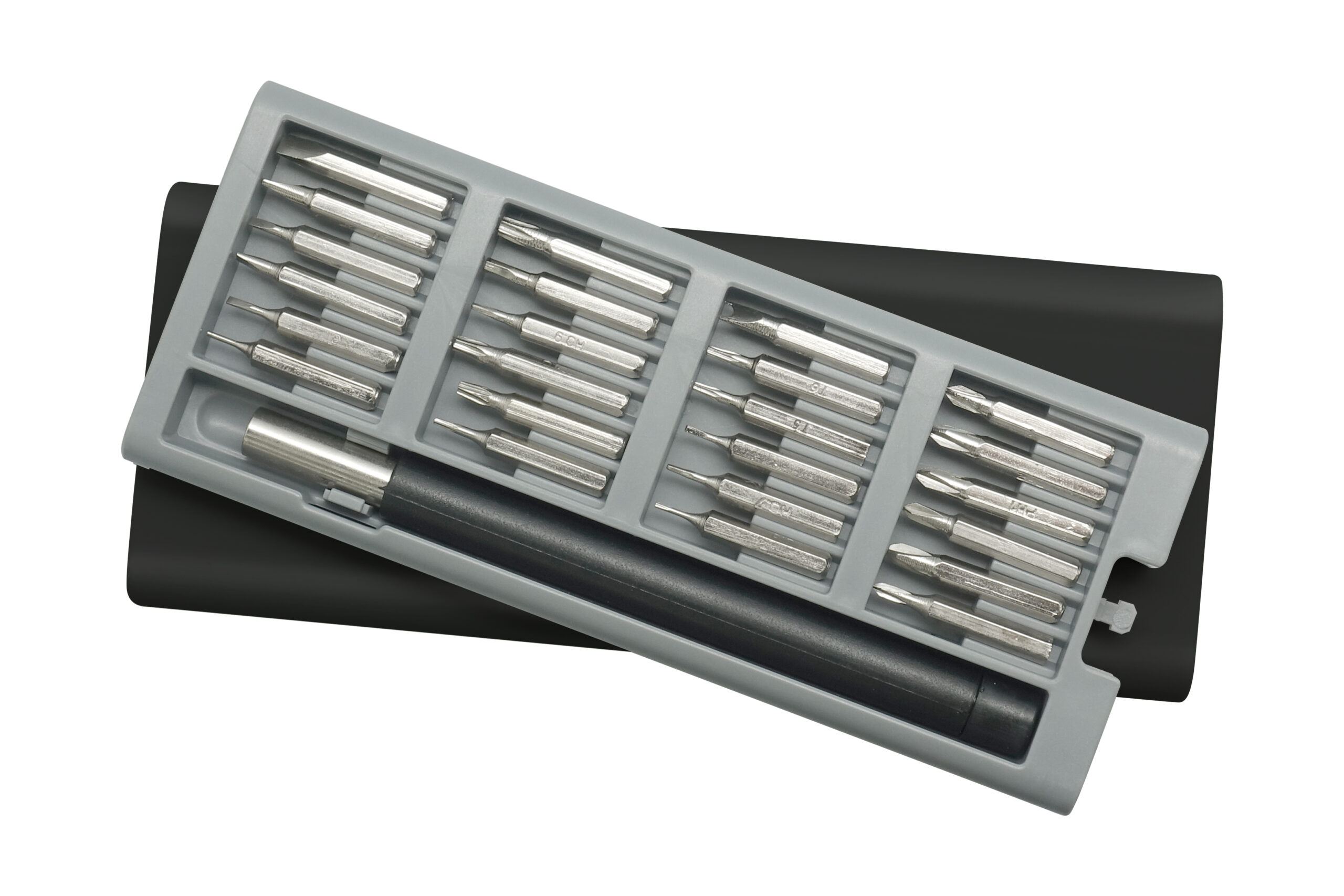 16,5 x 6,8 x 1,8 cm. Plástico y Acero.  Mango con punta imantada con 24 puntas diferentes. La caja viene con cuatro compartimentos imantados que permiten mantener ordenadas las diferentes puntas. La caja contiene apertura push.
