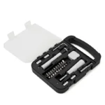 Set de herramientas, con en maletin de tapa transparente. Incluye: Llave allen, linterna, metro extensible, destornillador de puntas intercambiables. Medidas: 22 x 16 x 2,7 cm.