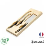 Set de queso de diseño francés con 3 utensillos de distintos tamaños. Los mismos vienen en una cuna de madera. Packaging: caja rígida de cartón laminada, la cual posee una ventana de cristal PVC. Medidas de la caja: 31 x 16 x 6 cm. Producto libre de BPA. Laguiole.
