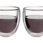 Ø 8 x 8 cm. Capacidad 220 ml cada vaso. Vidrio. Set de dos vasos doble pared. Apto para bebidas frías y calientes. Presentación en caja de regalo.