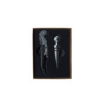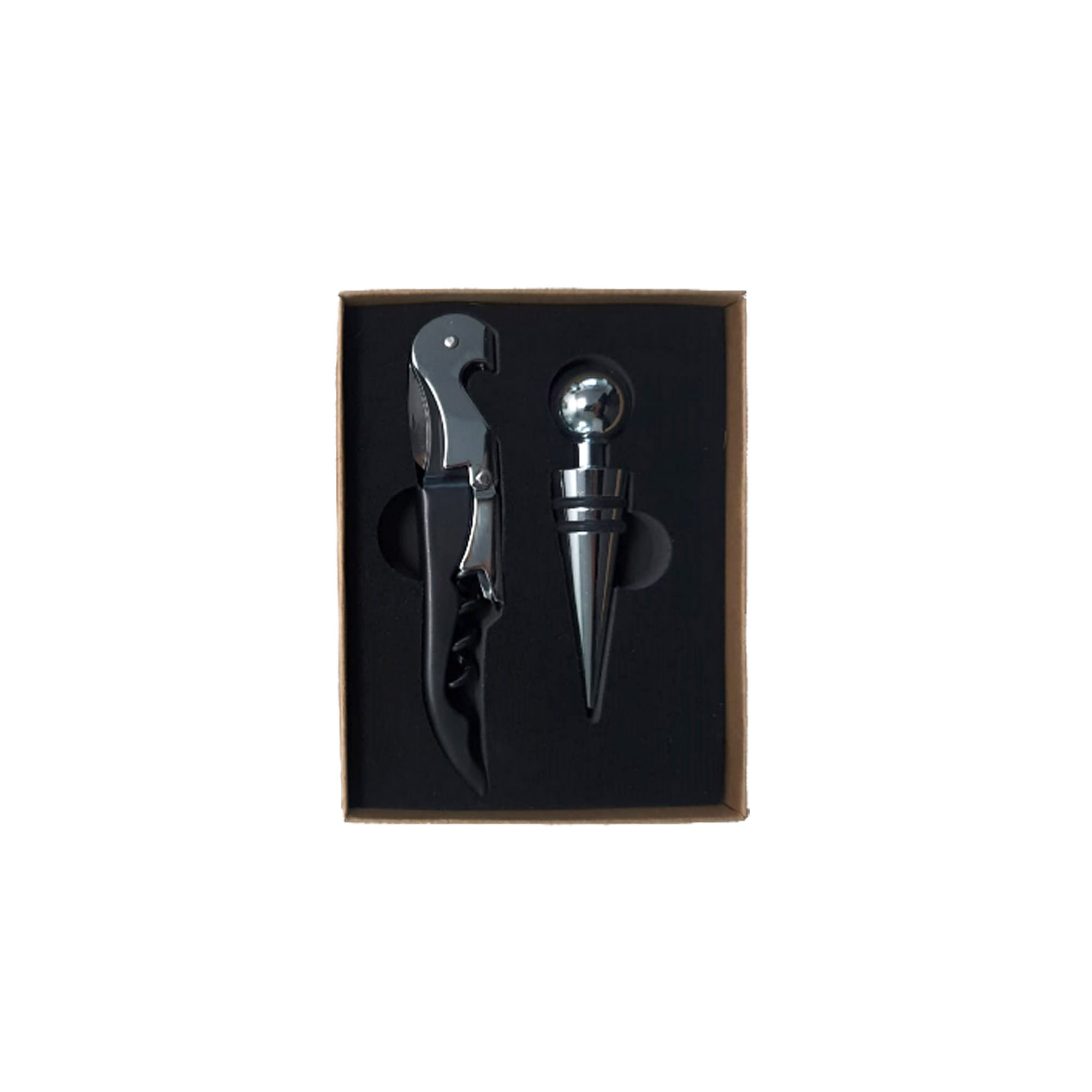 13 x 10 x 2,5 cm. Metal. Accesorios para vinos. Sacacorcho y tapón de metal. Estuche de cartón. Presentación en caja de regalo.