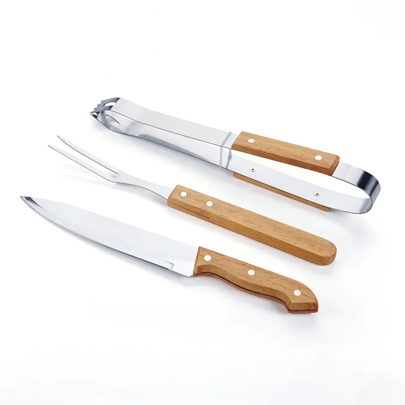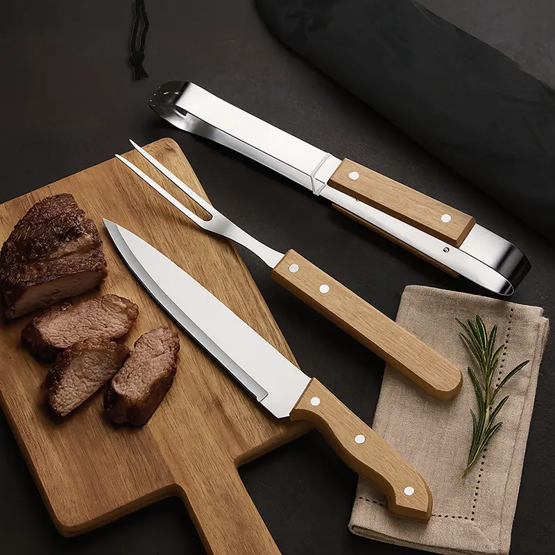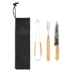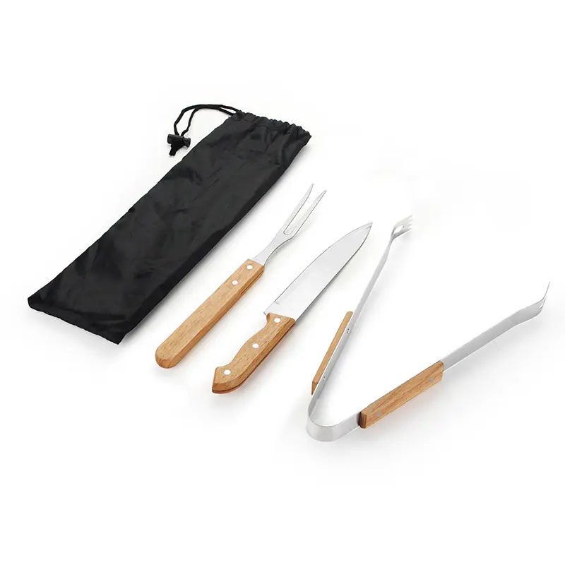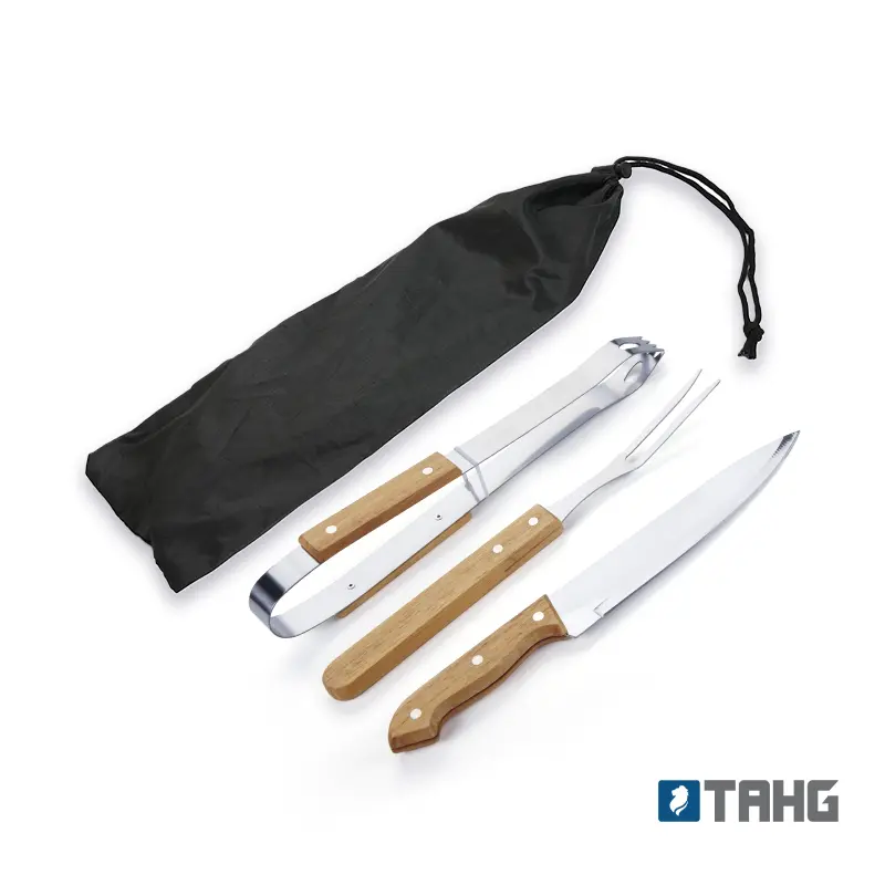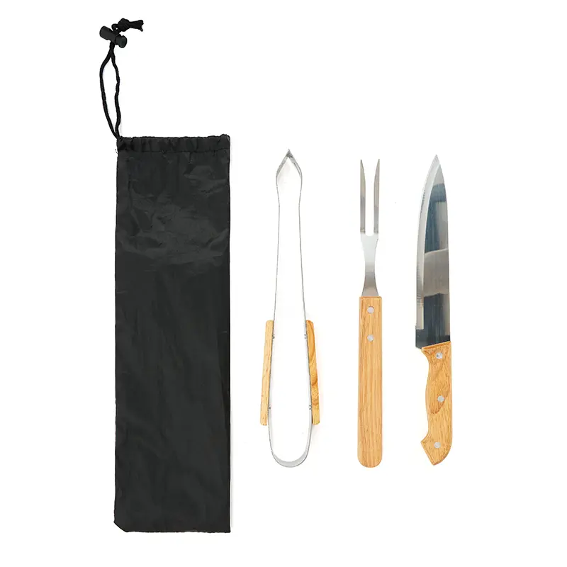 Set de asado con cuchillo, tenedor y pinza. Fabricado en madera de hevea y acero inoxidable 420. Contiene cuchillo, tenedor trinchador , pinza para asado y bolsa de guardado de nylon. Es ideal para manipular cortes de carne con precisión y comodidad durante la parrilla o asados al aire libre.