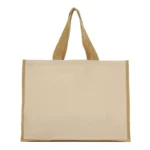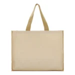 Tote bag fabricada en canvas de 320gsm (10 oz) combinada con yute laminado. Ideal para quienes buscan una bolsa amplia y resistente para transportar compras, libros u otros objetos de forma práctica y ecológica. Medidas: 35 x 46 x 19 cm. ReUseMe